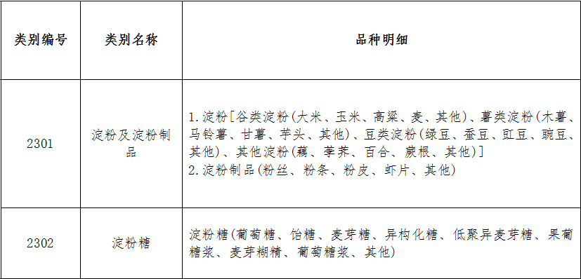 淀粉及淀粉制品類別編號及類別名稱:2301淀粉及淀粉制品;2302淀粉糖