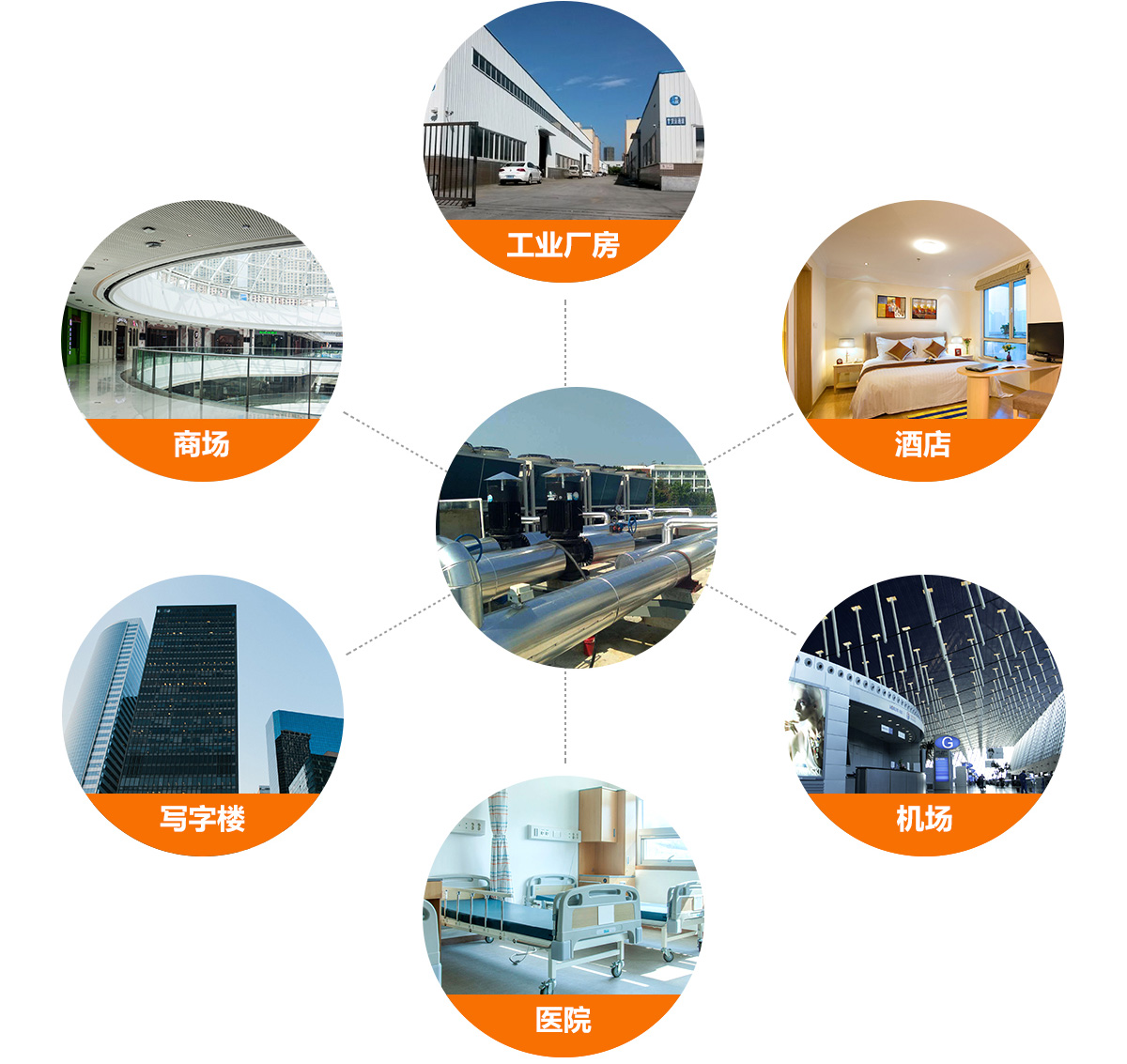 暖通空調(diào)工程應(yīng)用領(lǐng)域:工業(yè)廠房、商場(chǎng)、酒店、寫(xiě)字樓、醫(yī)院、機(jī)場(chǎng)