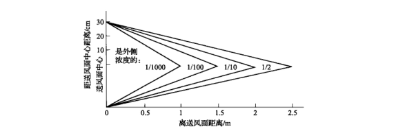 自凈器的作用有兩點(diǎn):一是設(shè)置于亂流潔凈室的四角和其他渦流區(qū),以減少灰塵滯留的機(jī)會(huì);二是作為操作點(diǎn)的臨時(shí)凈化措施。在面對(duì)自凈器潔凈氣流的距離上,可形成一個(gè)潔凈空氣籠罩的地段,在直流情況下,這一地段的空氣潔凈度和周圍空氣潔凈程度之比可如圖1所示。