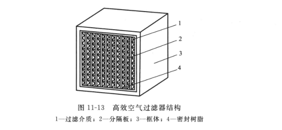 高效過濾器的特點是效率高、壓降大、不能再生,一般2~3年更換一次。高效過濾器對細菌的濾除效率接近100%,即通過高效空氣過濾器后的空氣可視為無菌空氣。此外,高效過濾器的安裝方向不能裝反。高效空過濾器的結構如圖11-13所示