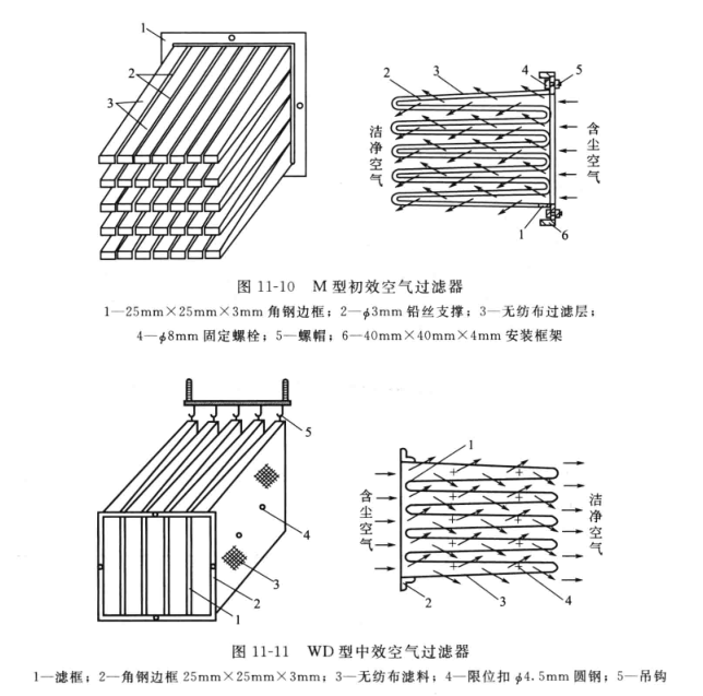 初效過濾器常用作凈化空調系統的一級過濾器,用于新風過濾,以濾除粒徑大于10μm的塵粒和各種異物,并起到保護中、高效過濾器的作用。此外,初效過濾器也可單獨使用。常用的M型初效空氣過濾器的結構如圖11-10所示。