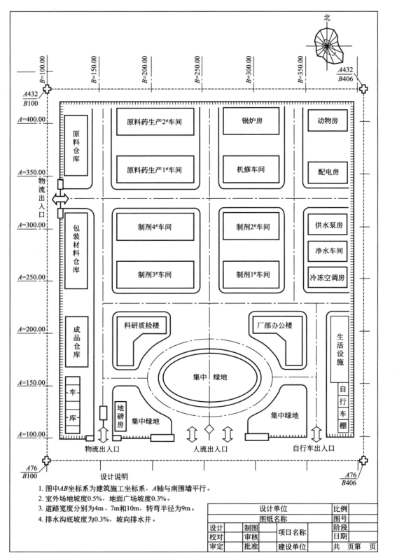 (2)建筑施工坐標系 若制藥廠廠區和建筑物的方位不是正南正北方向,即與地理測量坐標網不是平行的,而存在一定的方位角此時,用地理測量坐標網對廠區或建筑物進行定位,就必須經過繁瑣的換算,很不方便為減少廠區和建筑物定位時的麻煩,總平面設計常采用與廠區和建筑物方位一致的建筑施工坐標系。建筑施工坐標系的坐標軸分別用A和B表示,故又稱為AB坐標系。在AB坐標系中作間距為50m或100m的方格網,并標定出廠址和各建筑物的地理位置。由于AB坐標系以廠區或建筑物的方位為坐標軸,故在確定廠區和建筑物的位置時可避免繁瑣的換算,并給現場施工放線帶來了方便。
