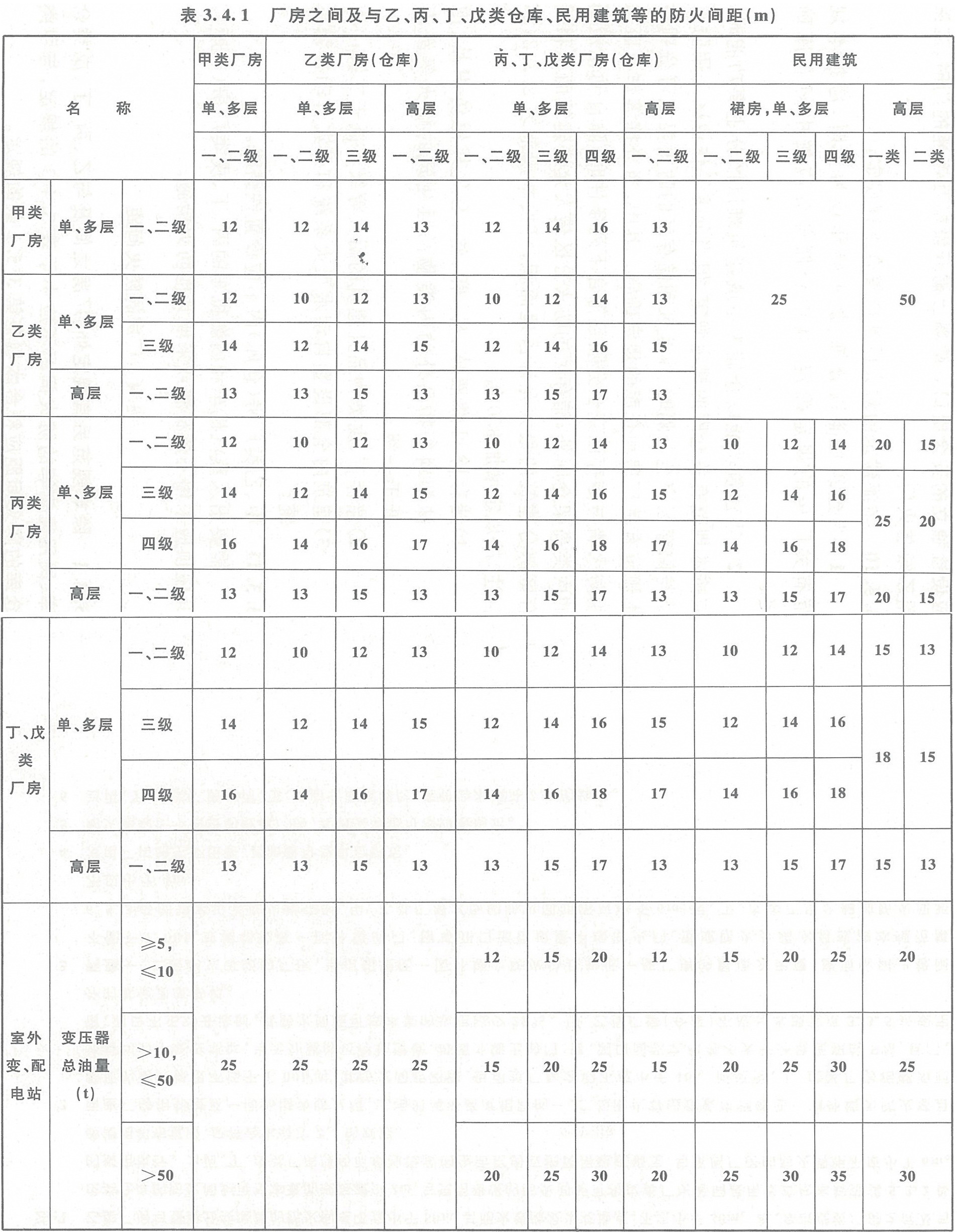 3.4.1 除本規范另有規定外,廠房之間及與乙、丙、丁、戊類倉庫、民用建筑等的防火間距不應小于表3.4.1的規定,與甲類倉庫的防火間距應符合本規范第3.5.1條的規定。