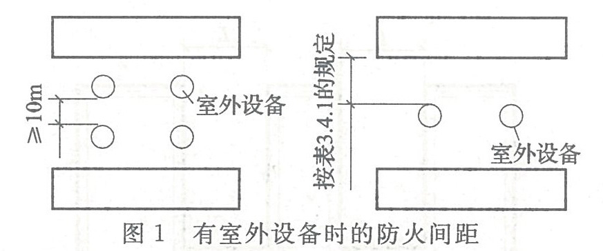 3.4.6 廠房外附設化學易燃物品的設備,其外壁與相鄰廠房室外附設設備的外壁或相鄰廠房外墻的防火間距,不應小于本規范第3.4.1條的規定。用不燃材料制作的室外設備,可按一、二級耐火等級建筑確定。