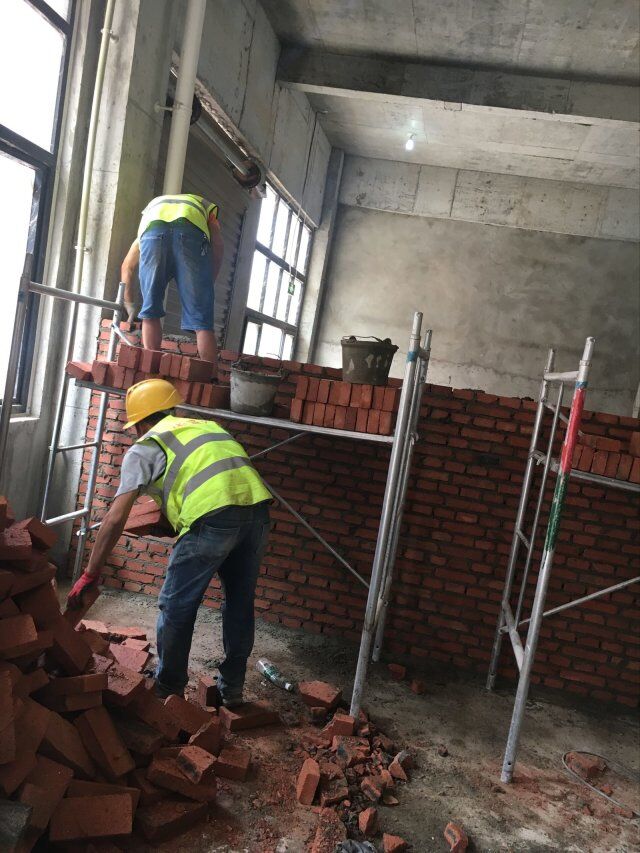 四川美料美味食品科技有限公司廠房裝修現(xiàn)場:排風(fēng)口安裝,地坪施工,地面貼磚