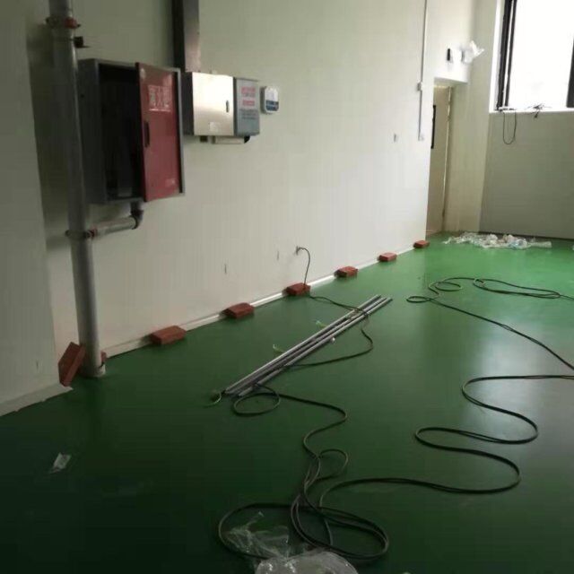 四川美料美味食品科技有限公司廠房裝修現(xiàn)場,環(huán)氧地坪漆施工,打膠條