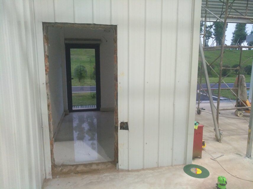 1,水電安裝完成, 2,傳遞窗,不銹鋼洗手池安裝完成, 3,彩鋼收尾完成