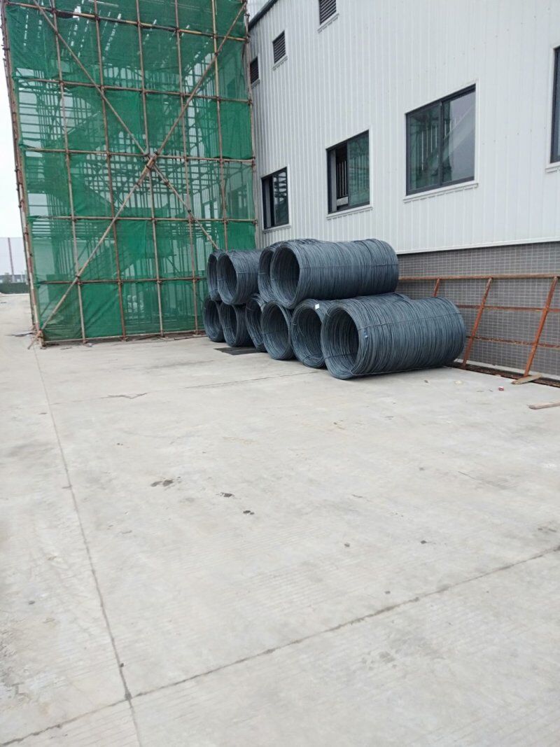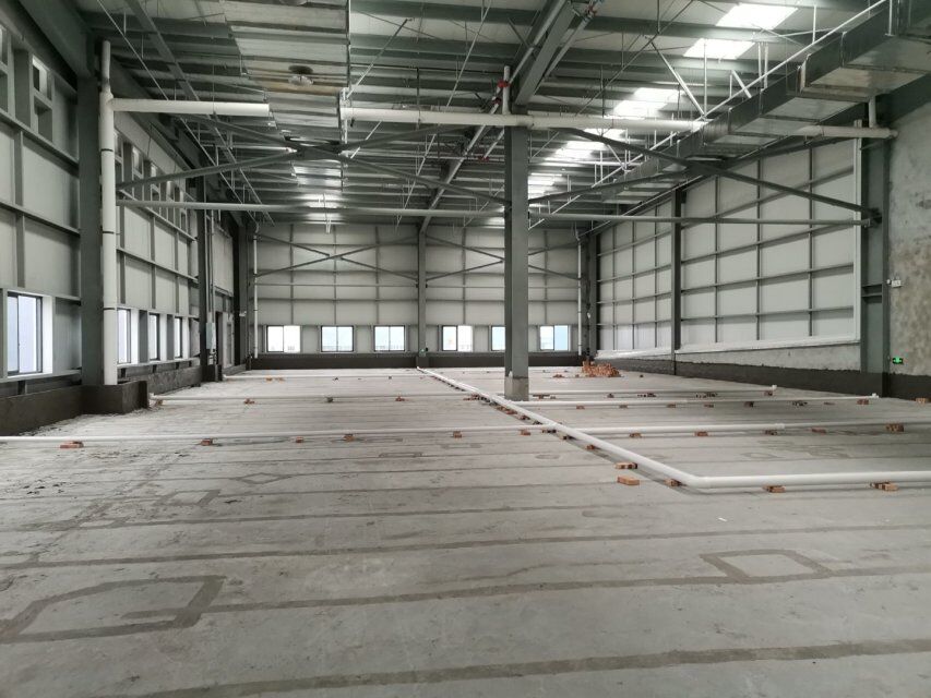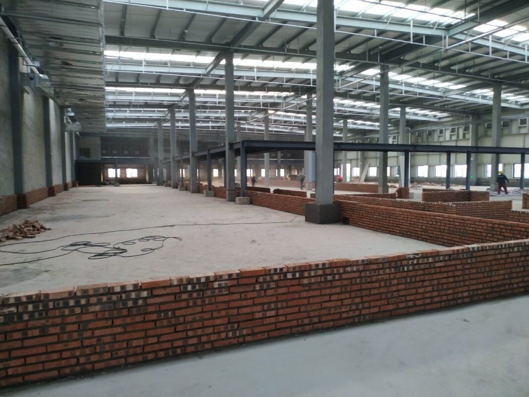 車間施工現(xiàn)場,鋼筋預(yù)制捆扎完成,擋水墻抹灰施工,排水溝貼磚完。
