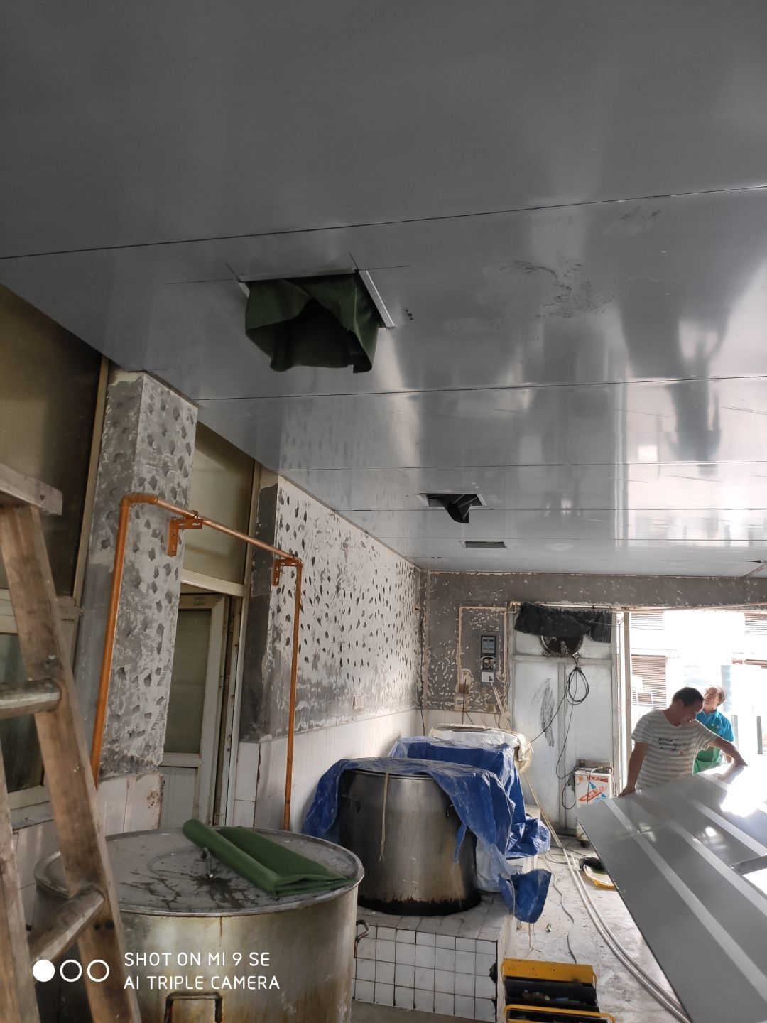 春之源廠房裝修現場:1.煙罩安裝完成50% 2.風機風柜吊裝完成 3.地坪修補完成