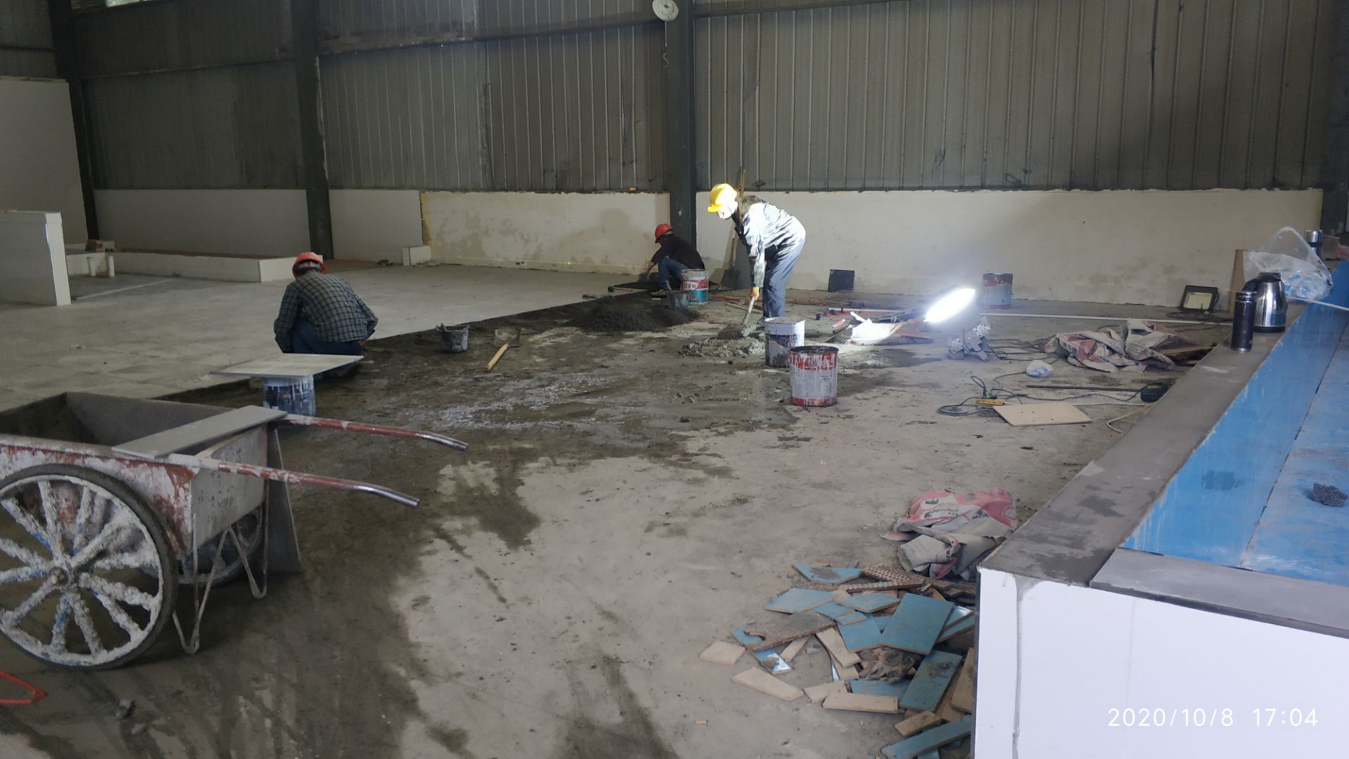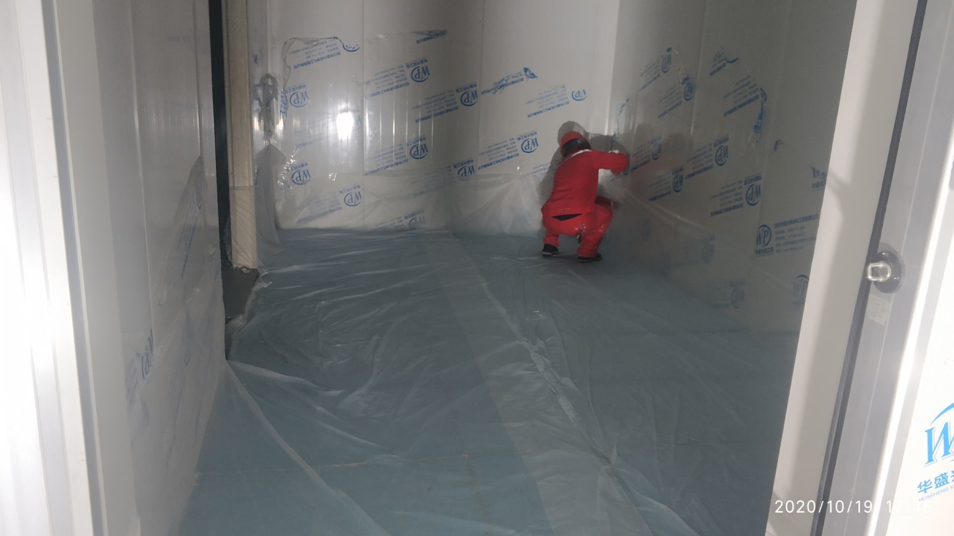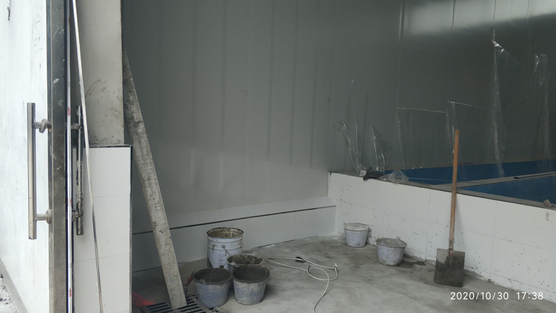 1.凍庫收邊收口完成百分之七十;2、凍庫門安裝完成百分之六十五; 3、生產車間地面鋪裝完成百分之七十; 4、生產車間排水溝貼磚完成。