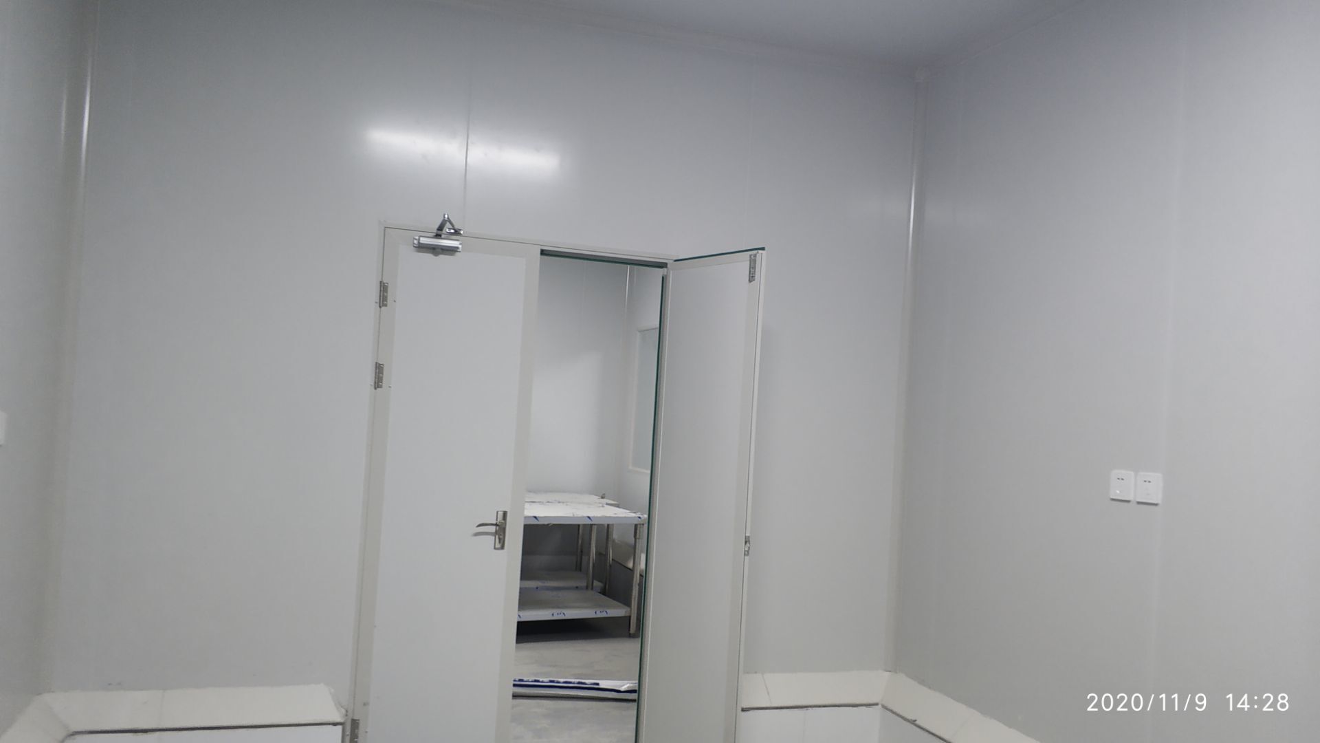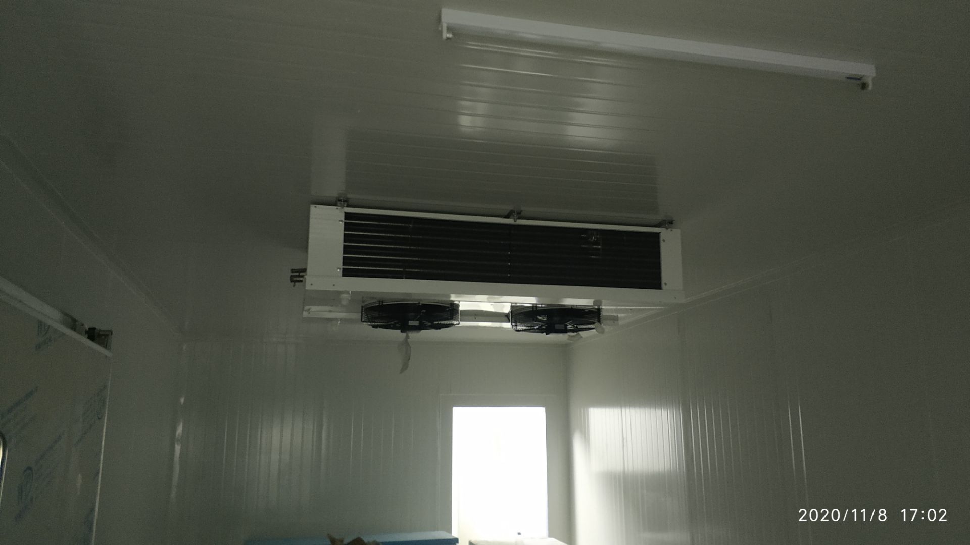 1.地面打磨完成分揀區域和后勤庫房。2.彩鋼組收邊收口,安裝門完成百分之八十。3.照明插座布線安裝完成百分之八十五。 4.凍庫內機組安裝完成。 5.卷簾門安裝完成。