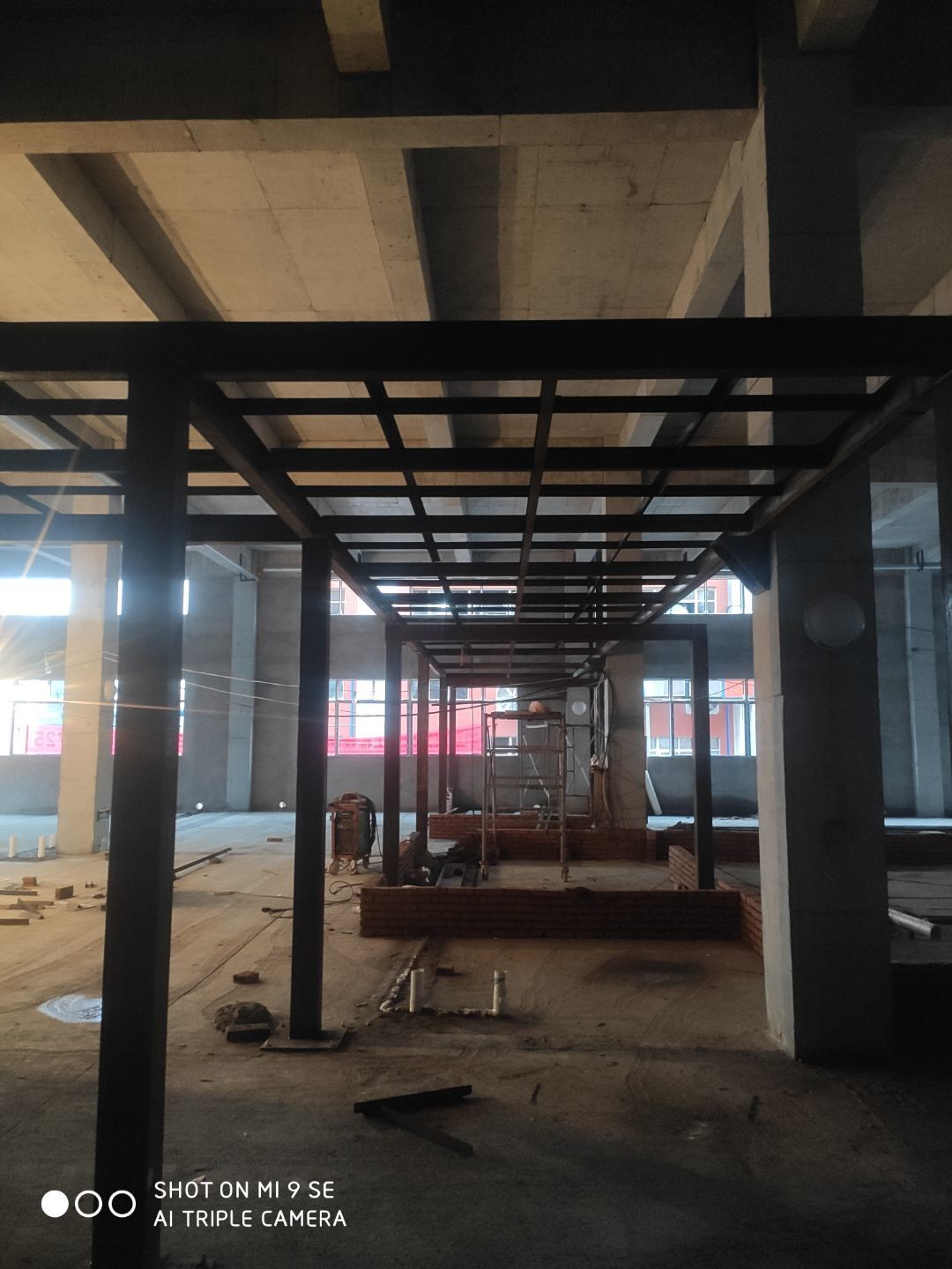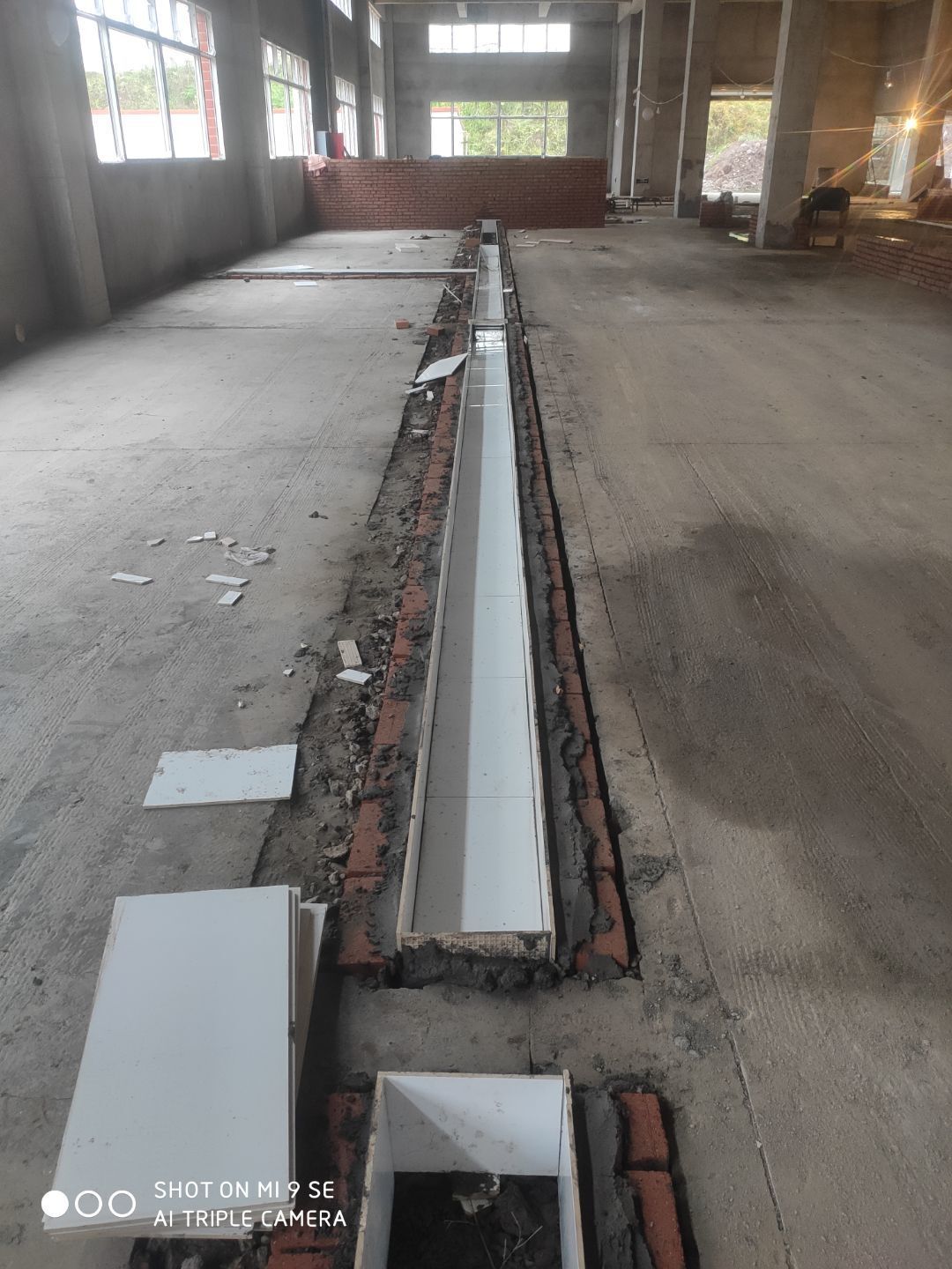 水溝貼磚完成百分之八十 地坪打磨完成 參觀通道鋼柱立完