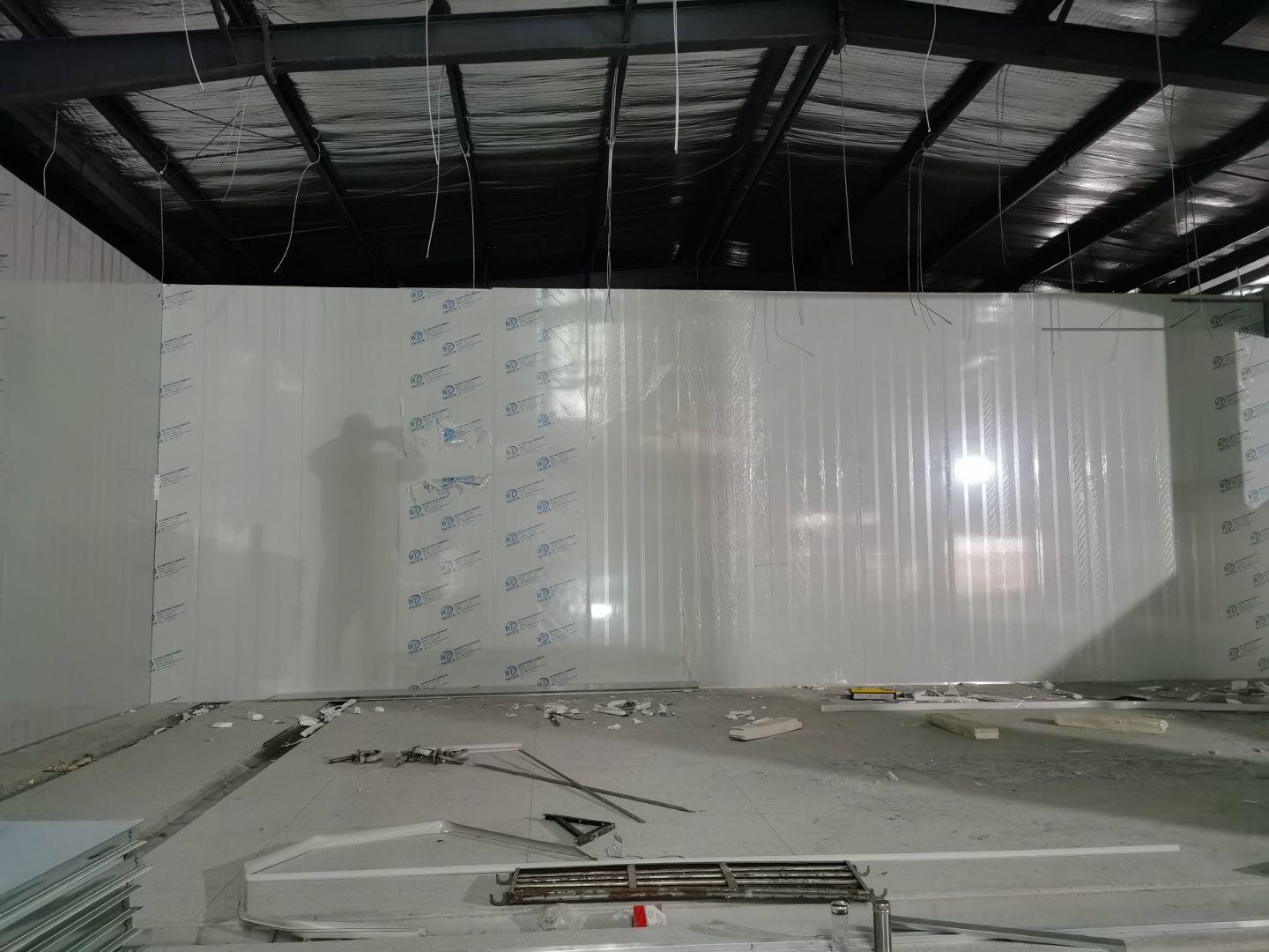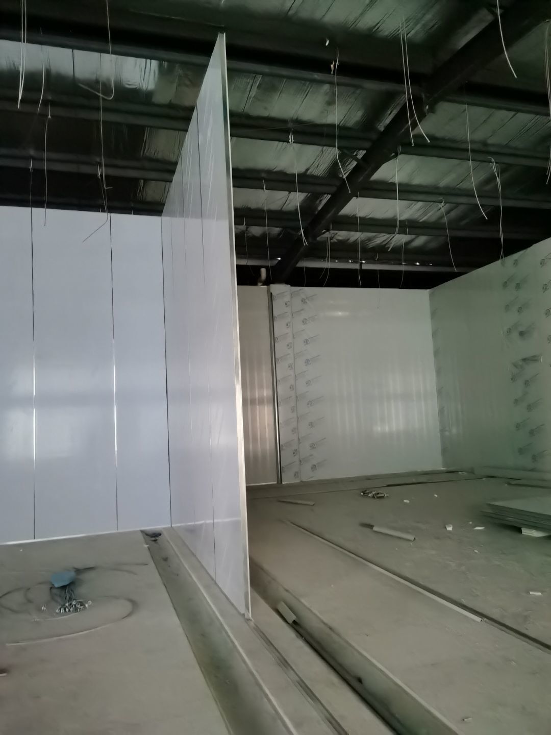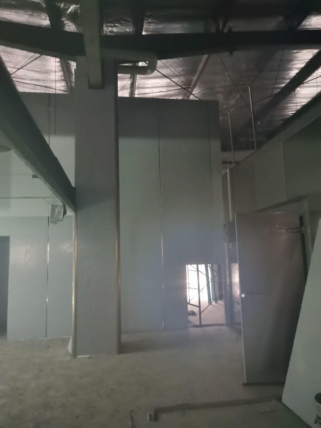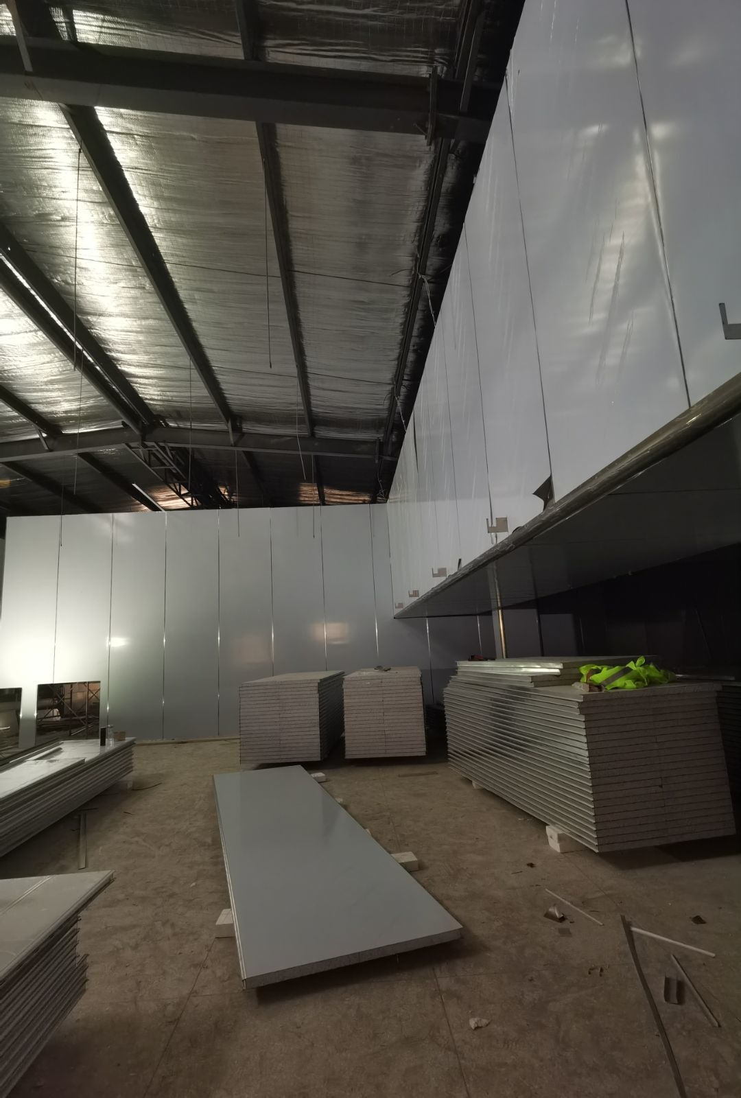 1、鋼接構完成70%;2、凍庫完成100%;3、彩鋼板開始立墻板