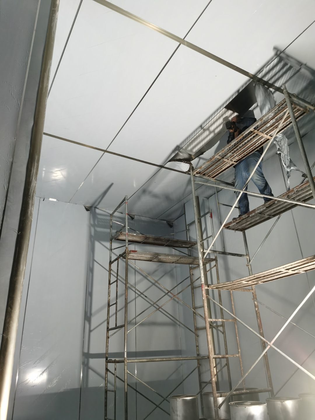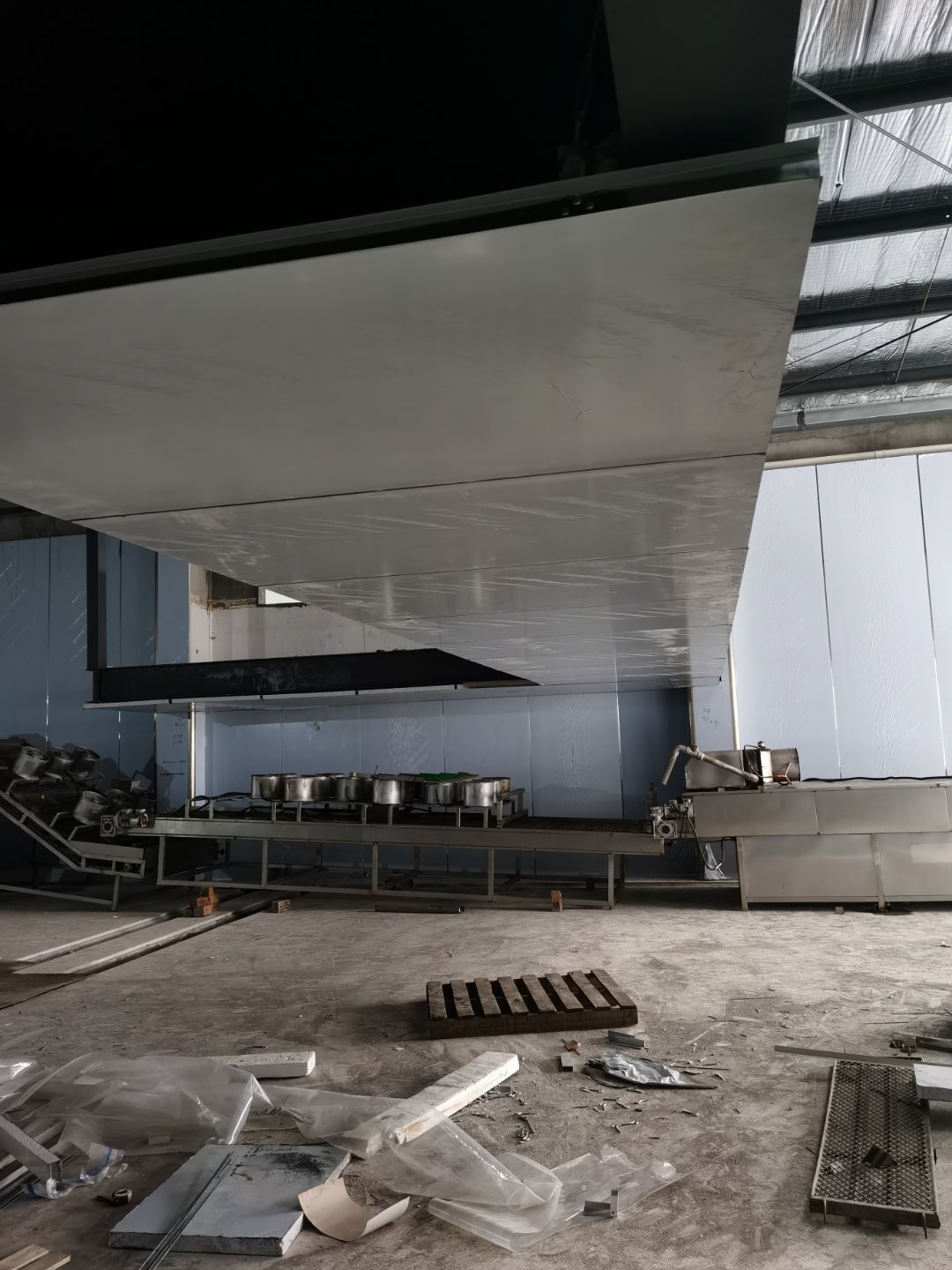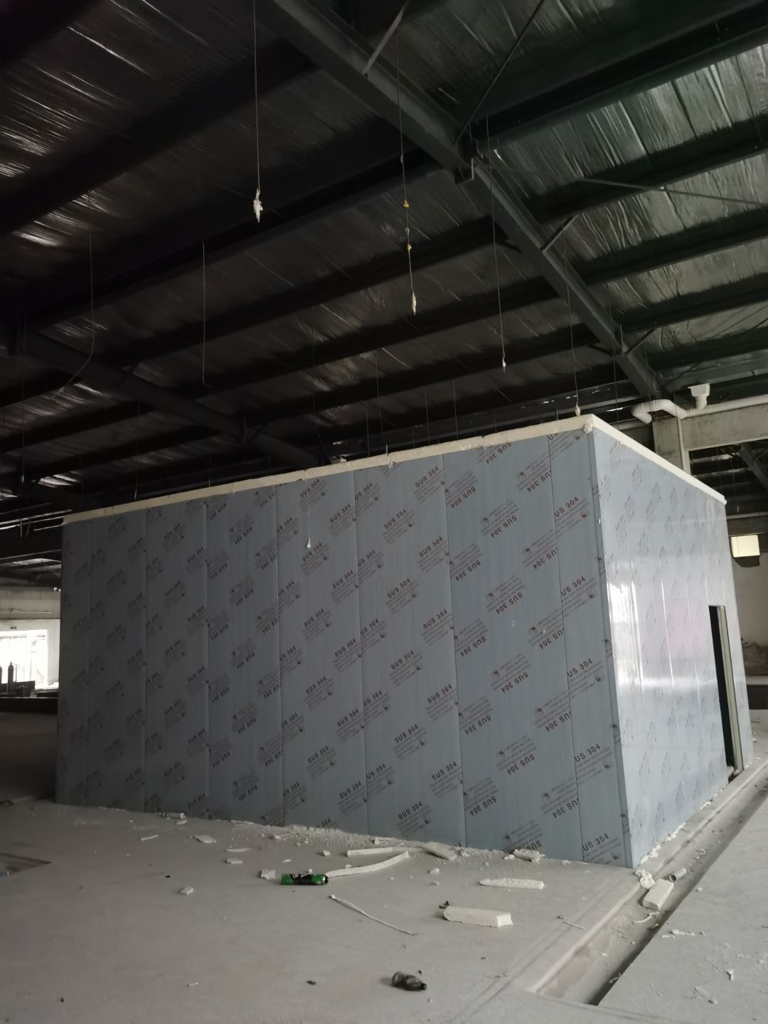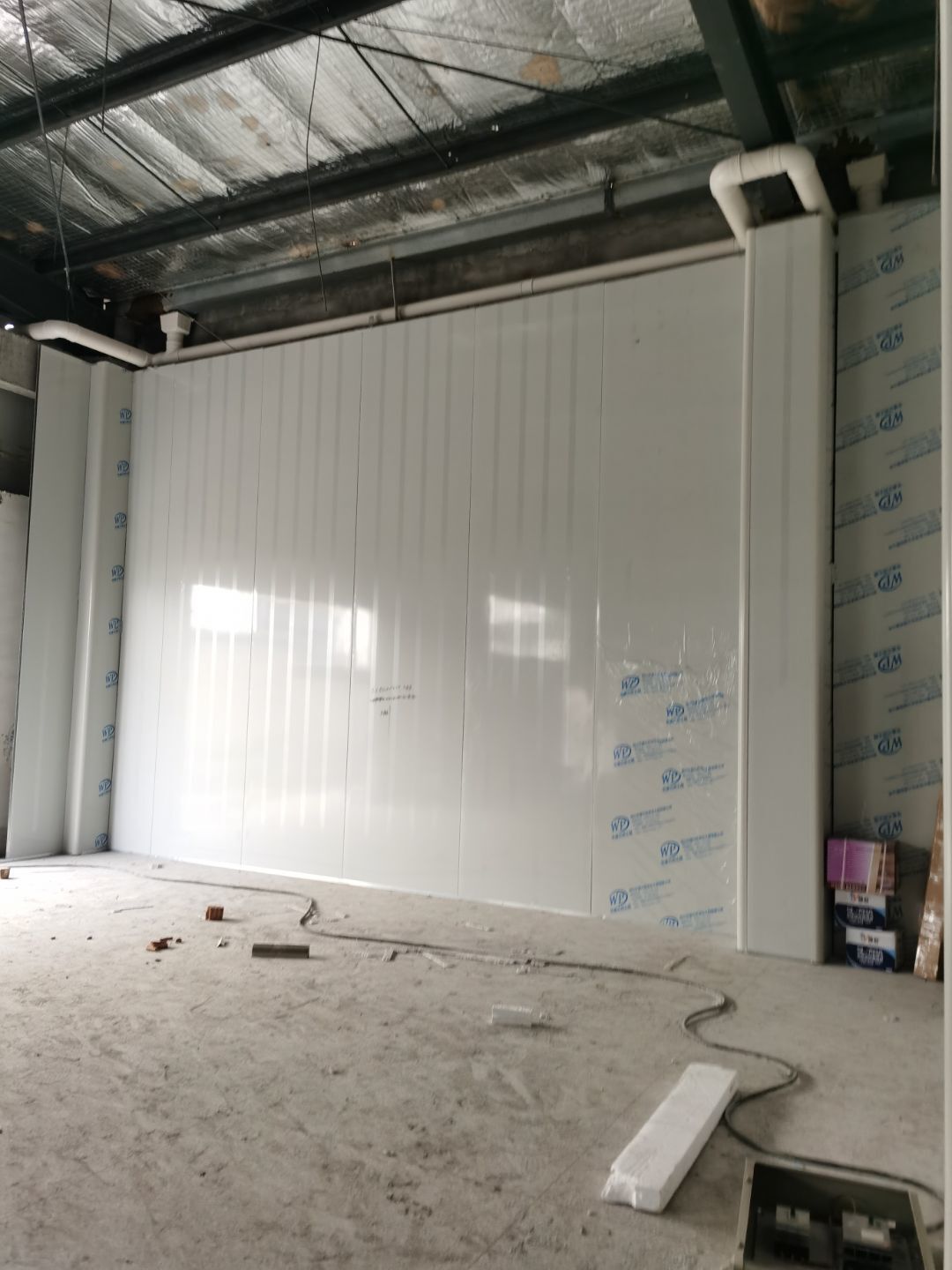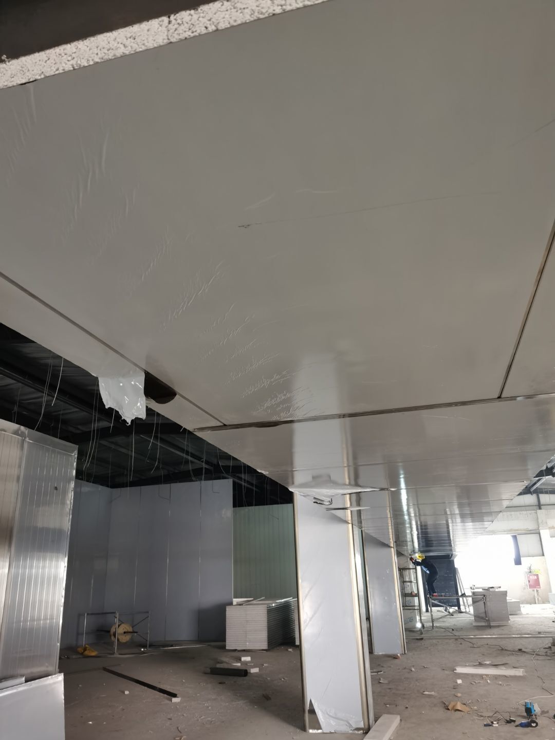 1、鋼接構完成70%;2、凍庫完成100%;3、彩鋼板開始立墻板