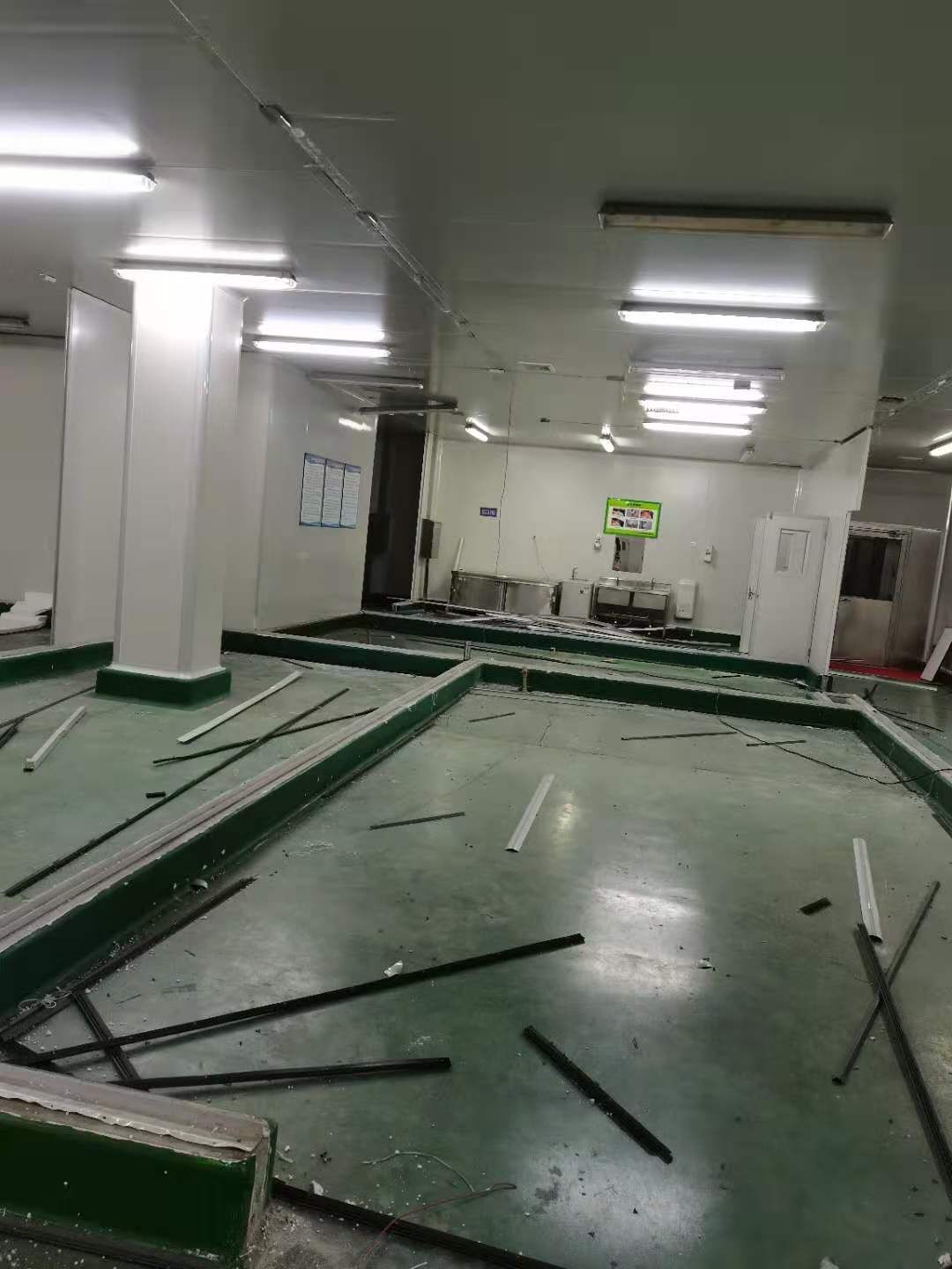 1、墻板拆除完成95%; 2、開關(guān)插座拆除完成95%; 3、外包間及反應(yīng)釜車間燈具拆除完成100%; 4、場地清理。