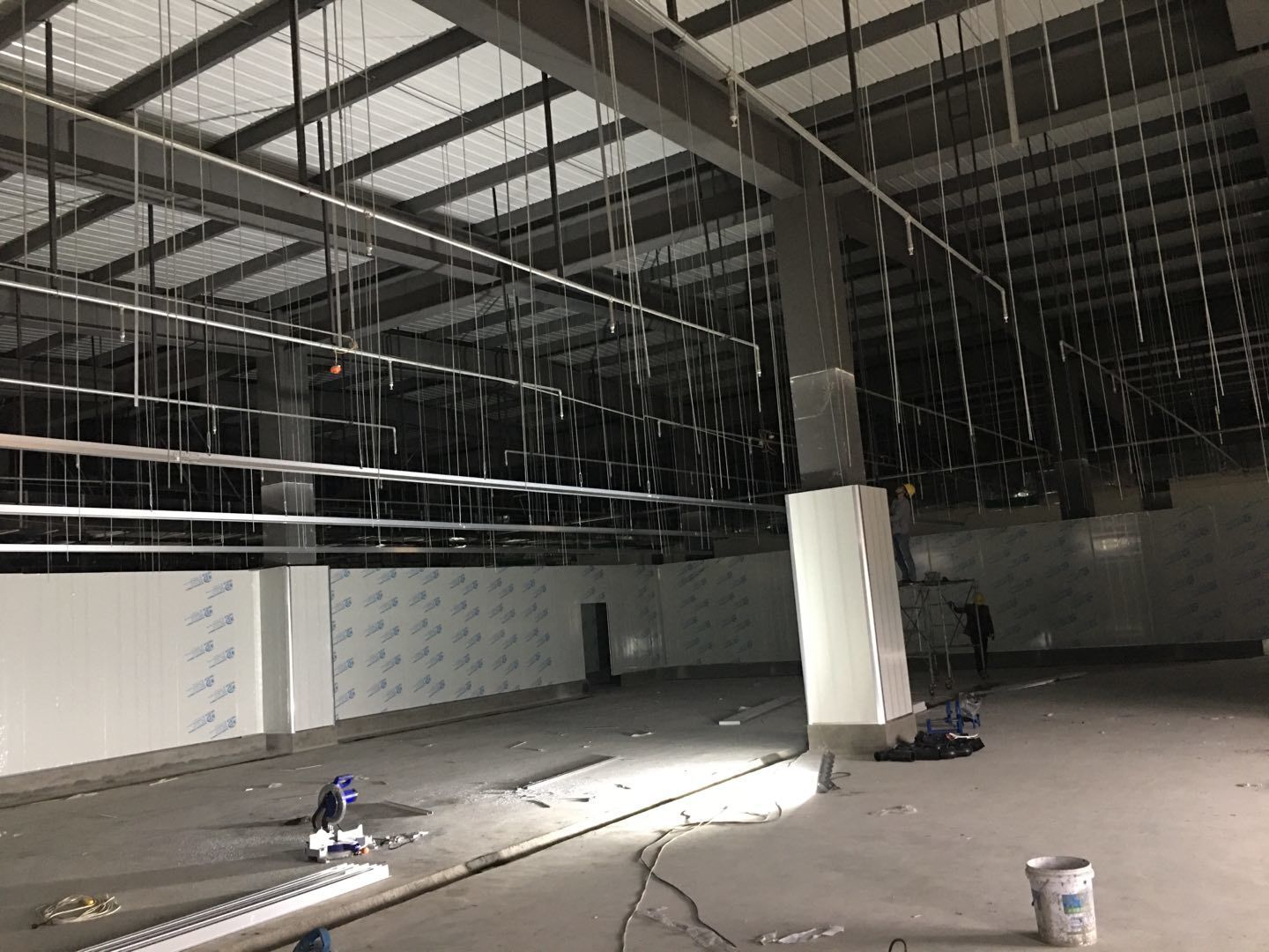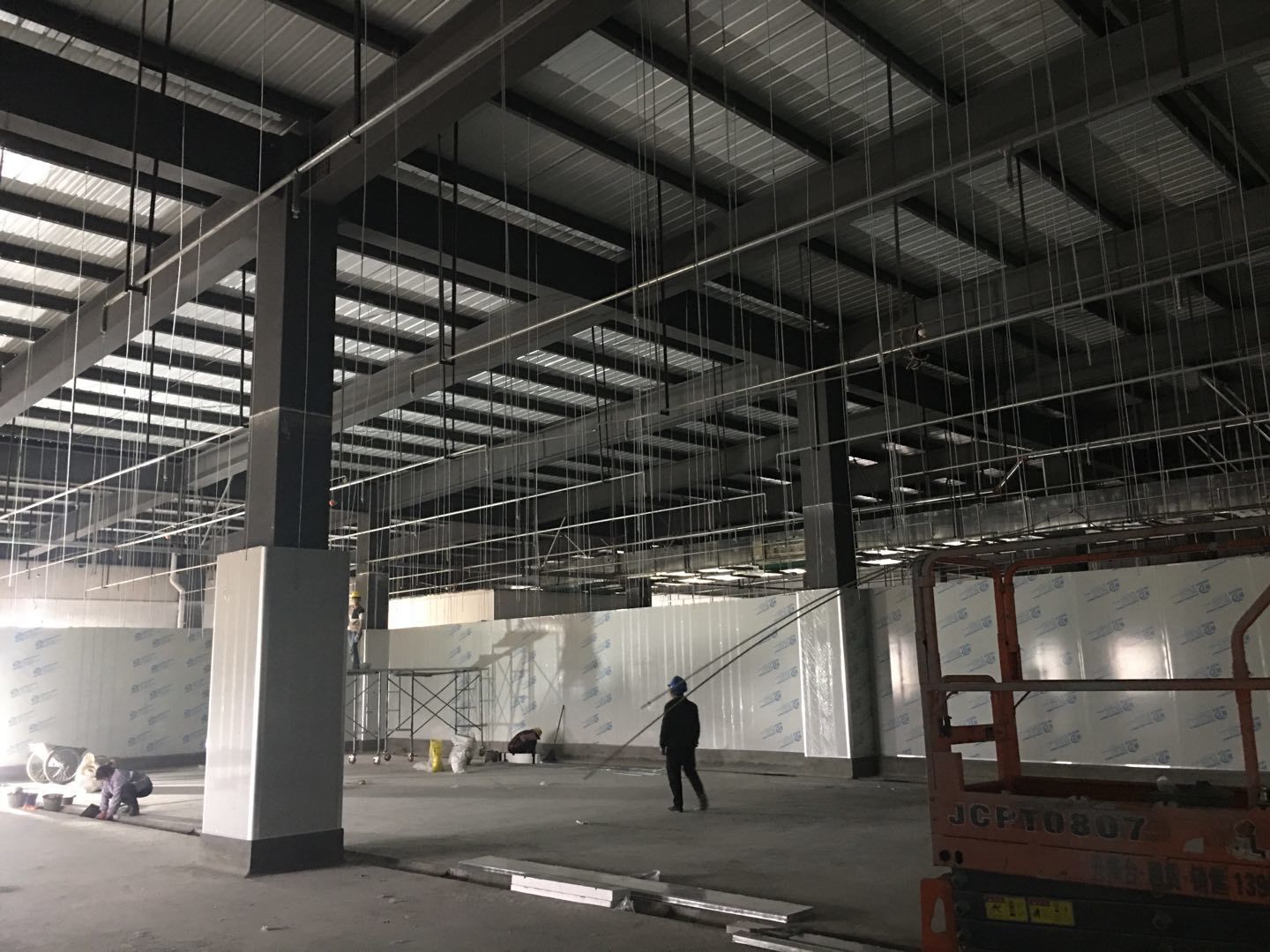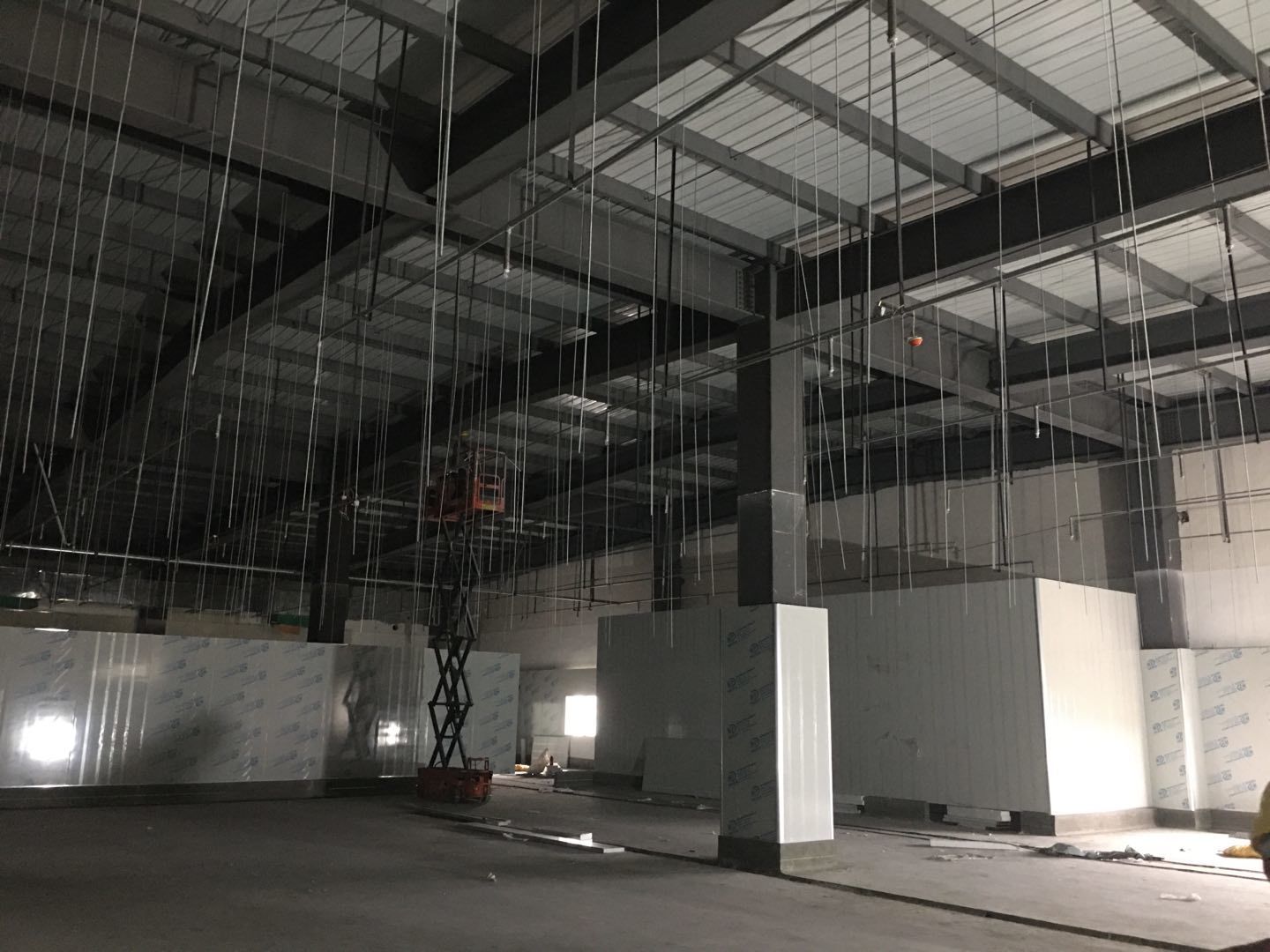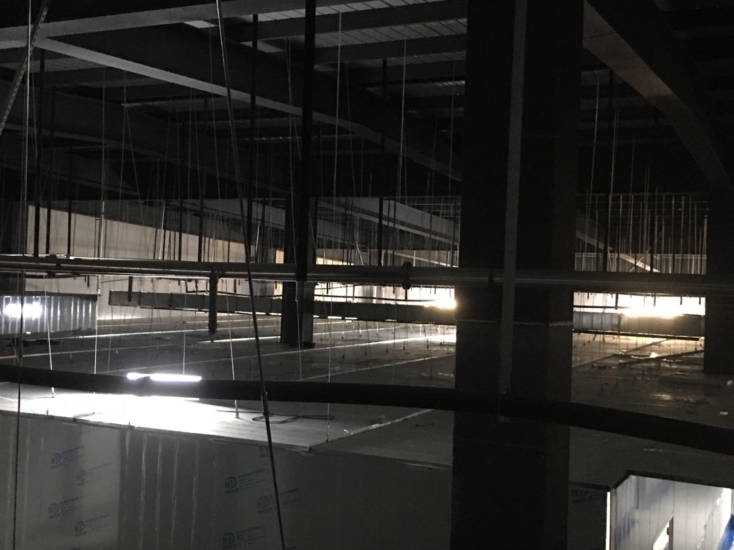 1.簽證彩板內包材庫未封頂,門窗已投合,明日開始全面開預留孔2.空調班組、風盤絲桿支架固定,管道布置焊接。3.水電班組-燈具安裝,配線配管。全部燈具安裝完成。
