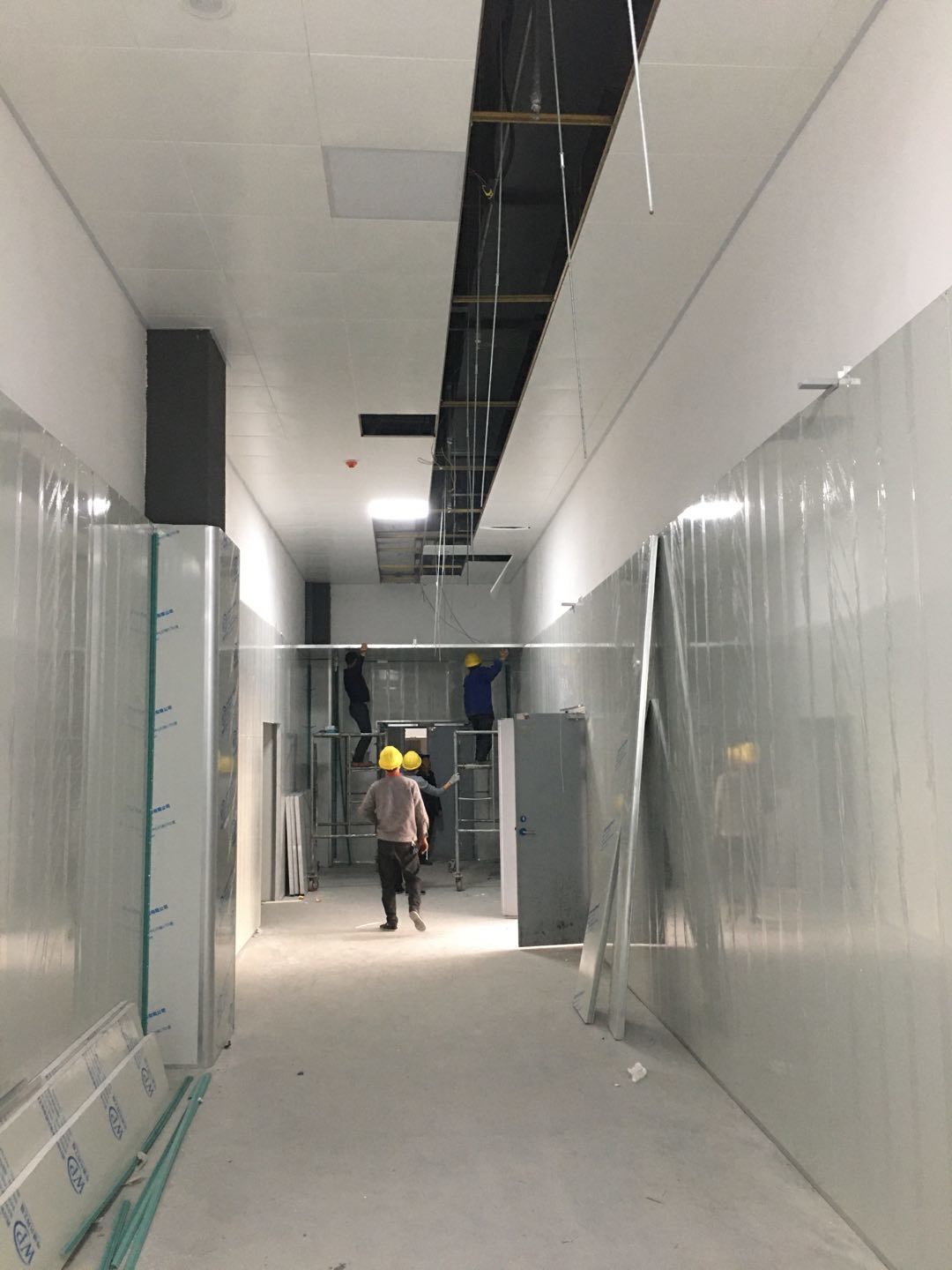 1:泡制車間T型鋁掛設完成2:前處理區絲桿掛設完畢,整體進度約為65%。3:隔墻通道門洞包飾處理進度較慢,已完成約25%