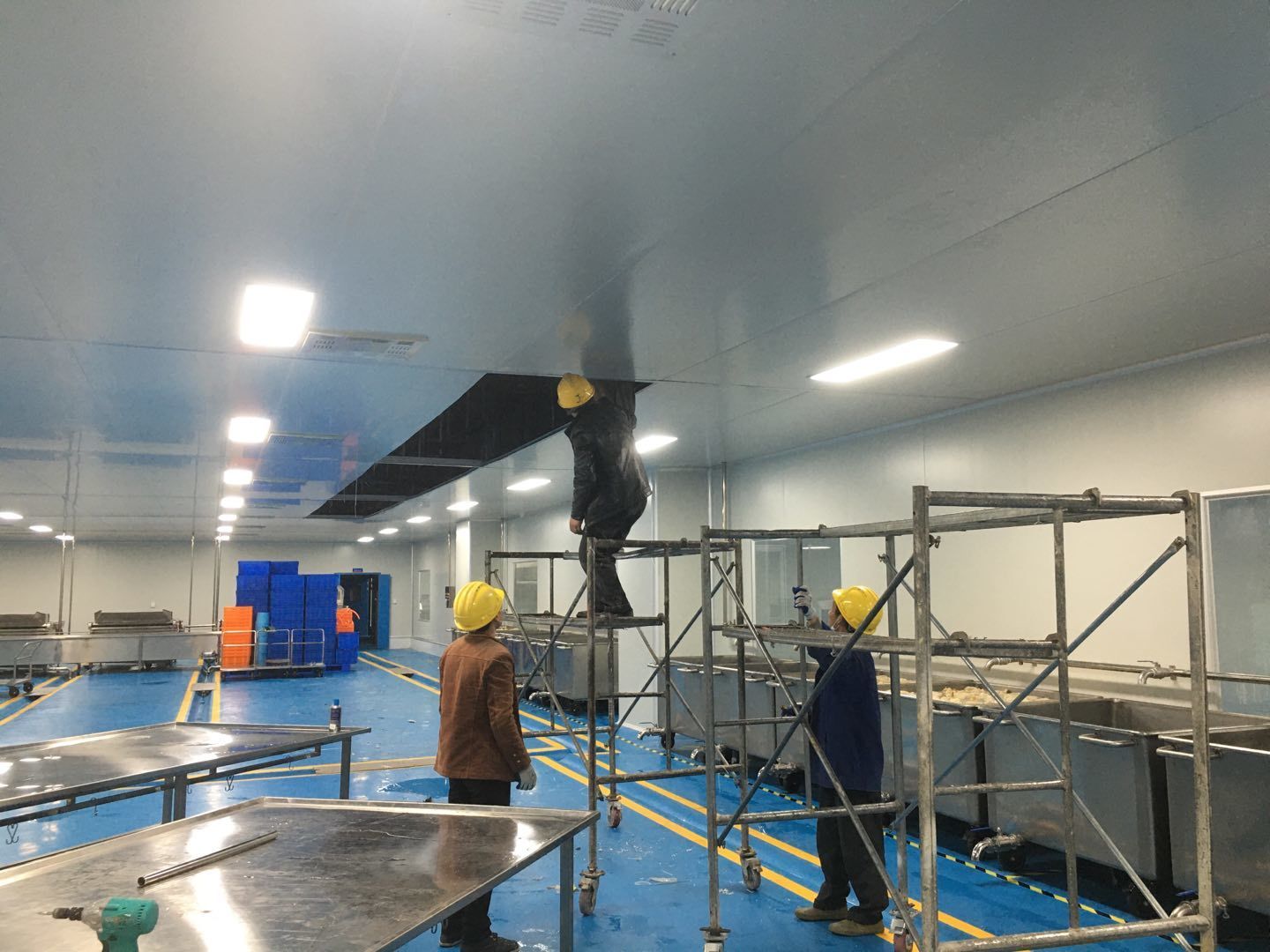 1:彩板班組~收尾工作進度50%左右。2:空調班組~主要設備及風道均已吊裝完成。剩余工作:主機配管,配線調試,安裝風口。3:水電班組-空調電源配線完成約35%,剩余工作:動力電施工,吊頂到給水點位的不銹鋼管施工,配電箱安裝調試。