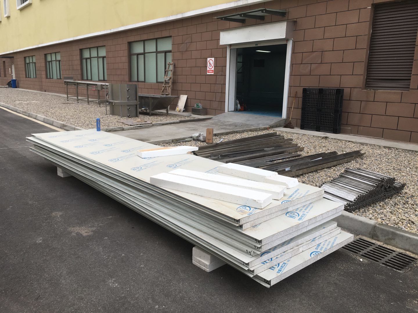1:彩板吊頂全部門框扣料完成,門板構件同步制作中。收尾工作分區域暫進行配合地坪施工。2:空調班組~風管合縫完成,完成材料轉運至二樓,主機設備到場卸裝。3:水電班組-控制線配線完成80%,樓頂配管20%左右。
