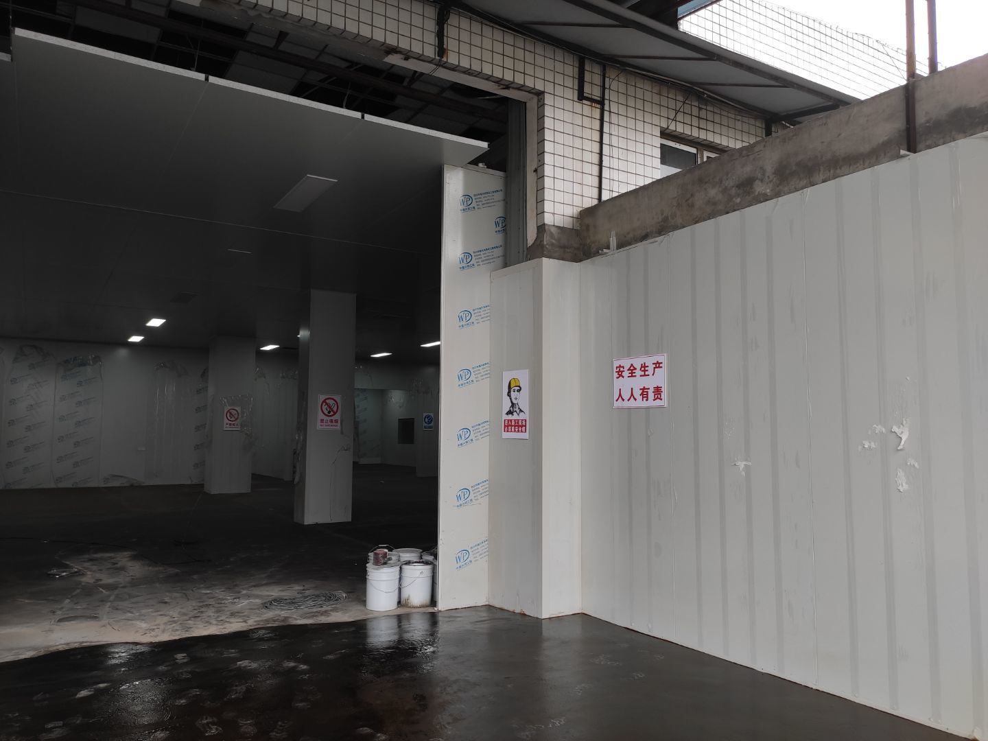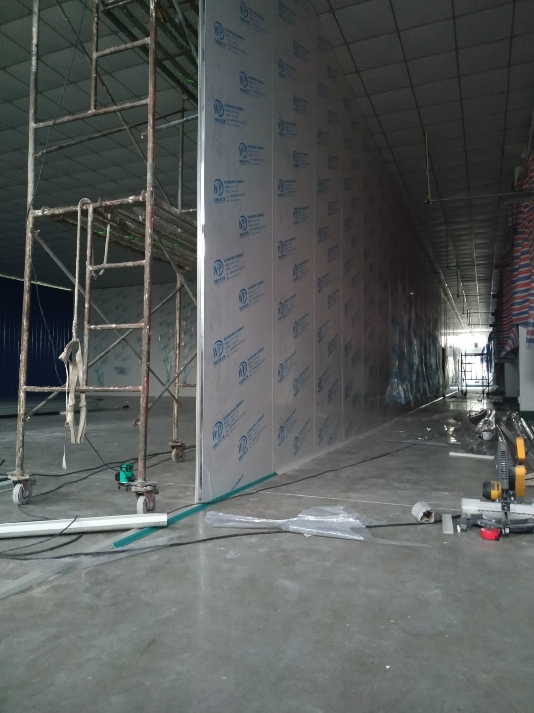周轉框清洗間彩鋼板吊頂安裝完成,庫房撕膜打膠完成,周轉框清洗間彩鋼瓦墻板安裝完成。撕膜完成40%,圓弧安裝完成50%。