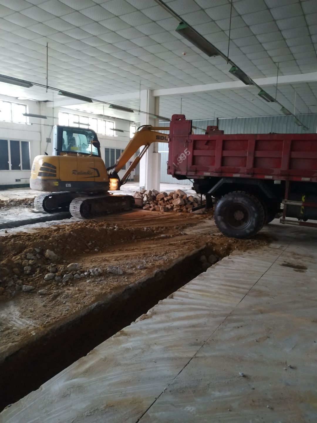 機器設備已到現場 地面施工,打磨完成底漆施工完成 水電工程,車間燈全部通電