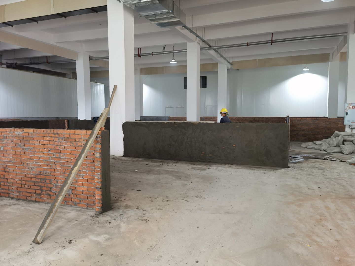 1. 擋水墻防水涂抹。2.水磨石墊層完成。3.凍庫金剛砂地坪完成