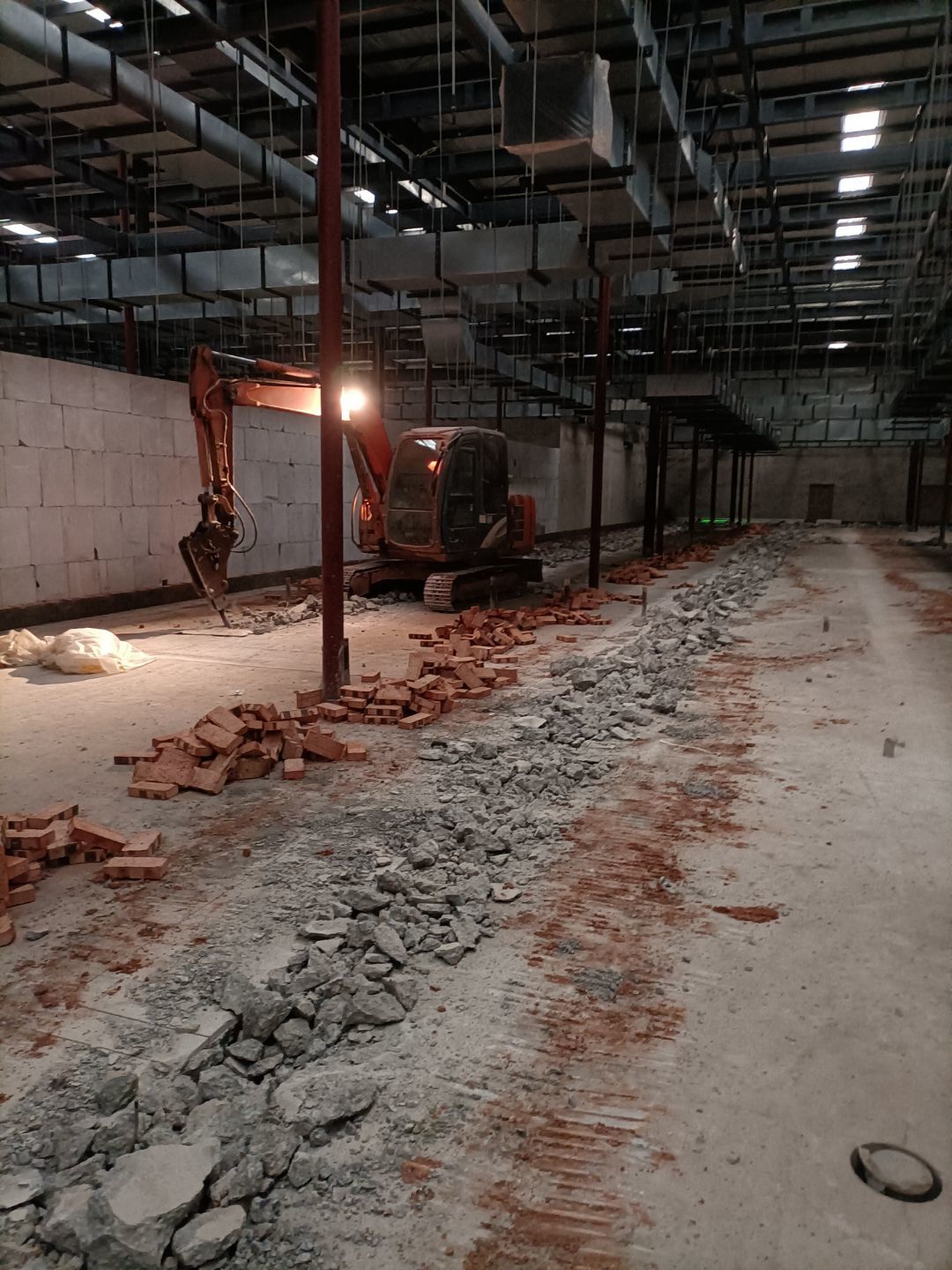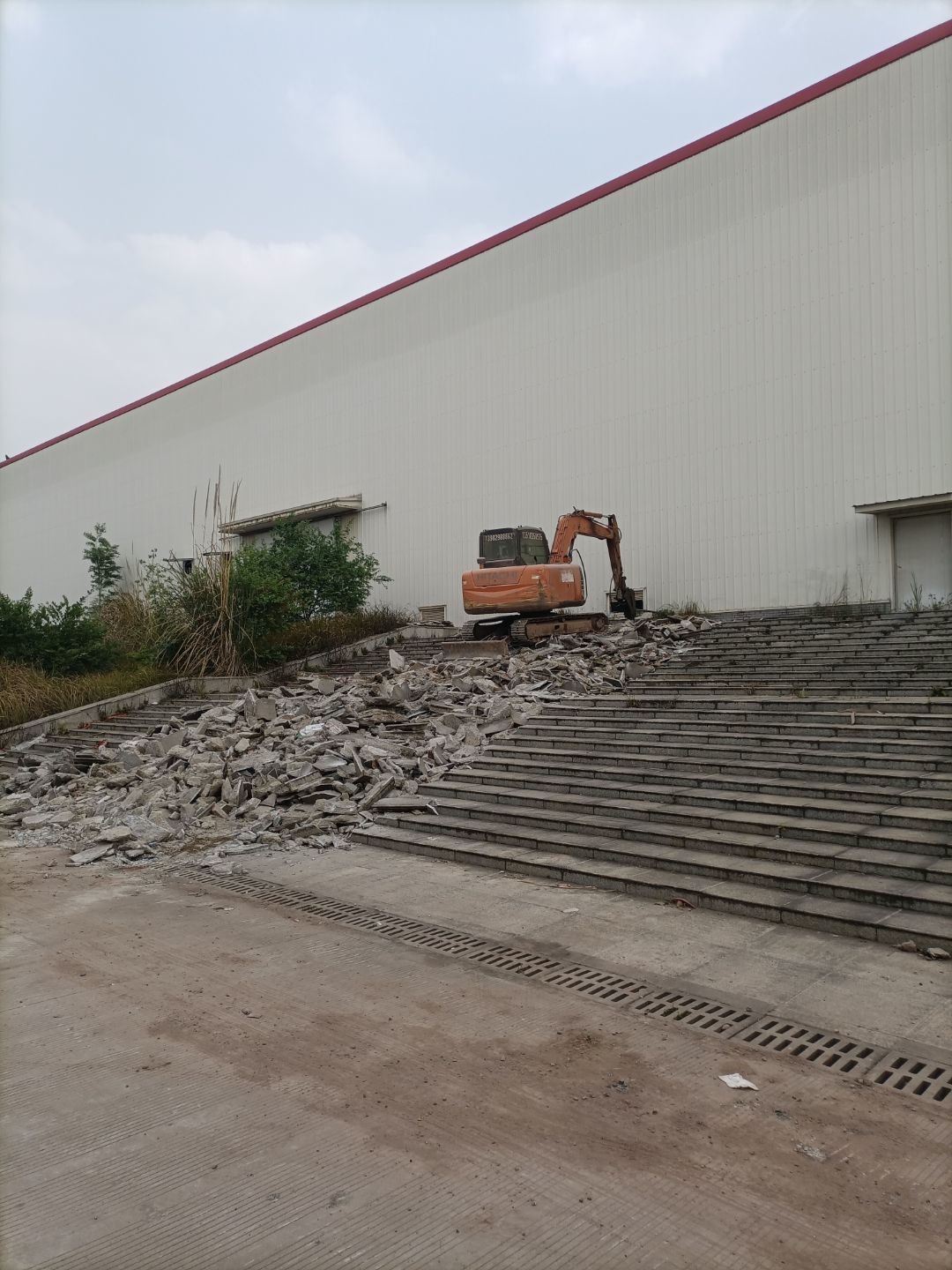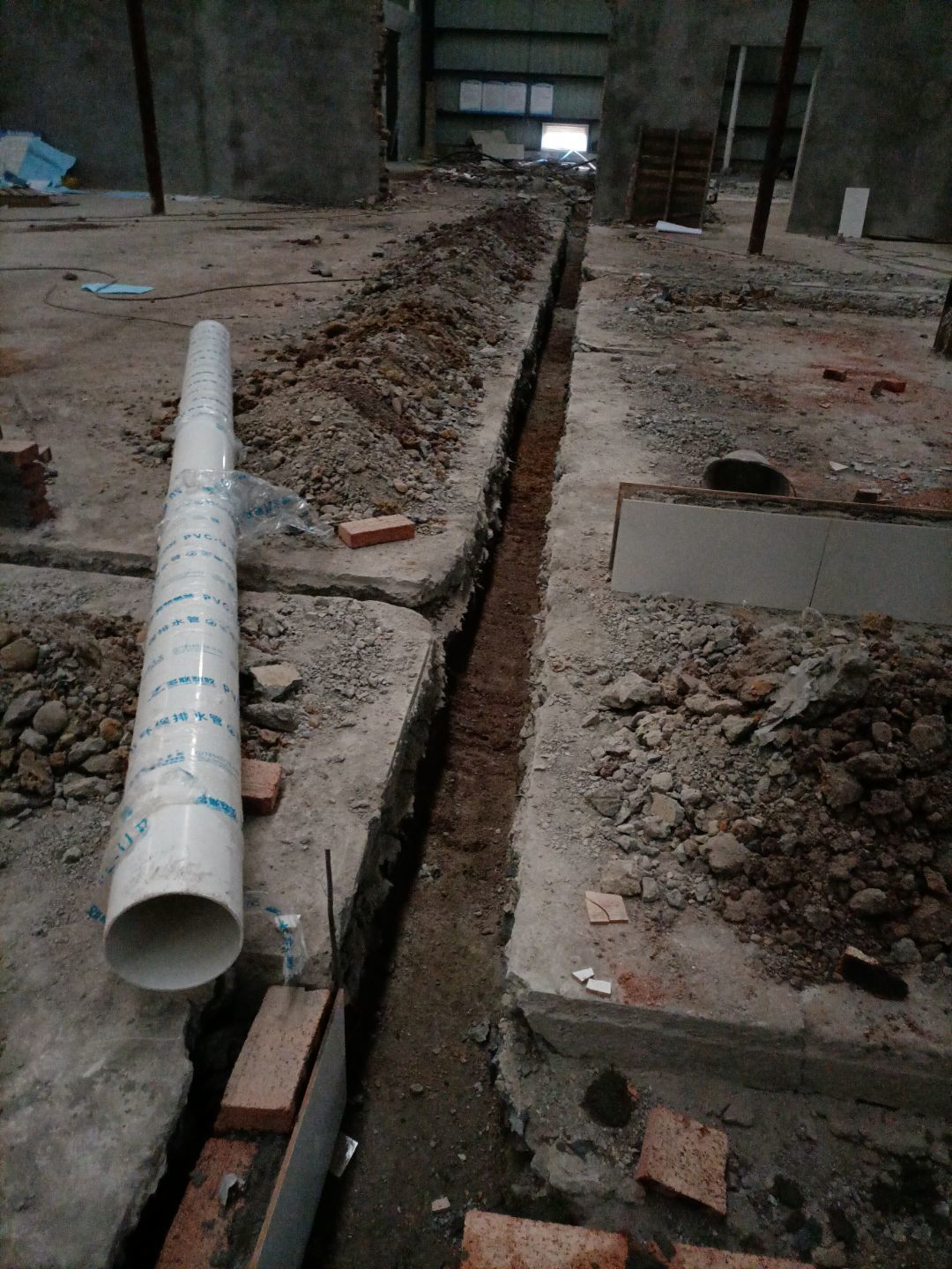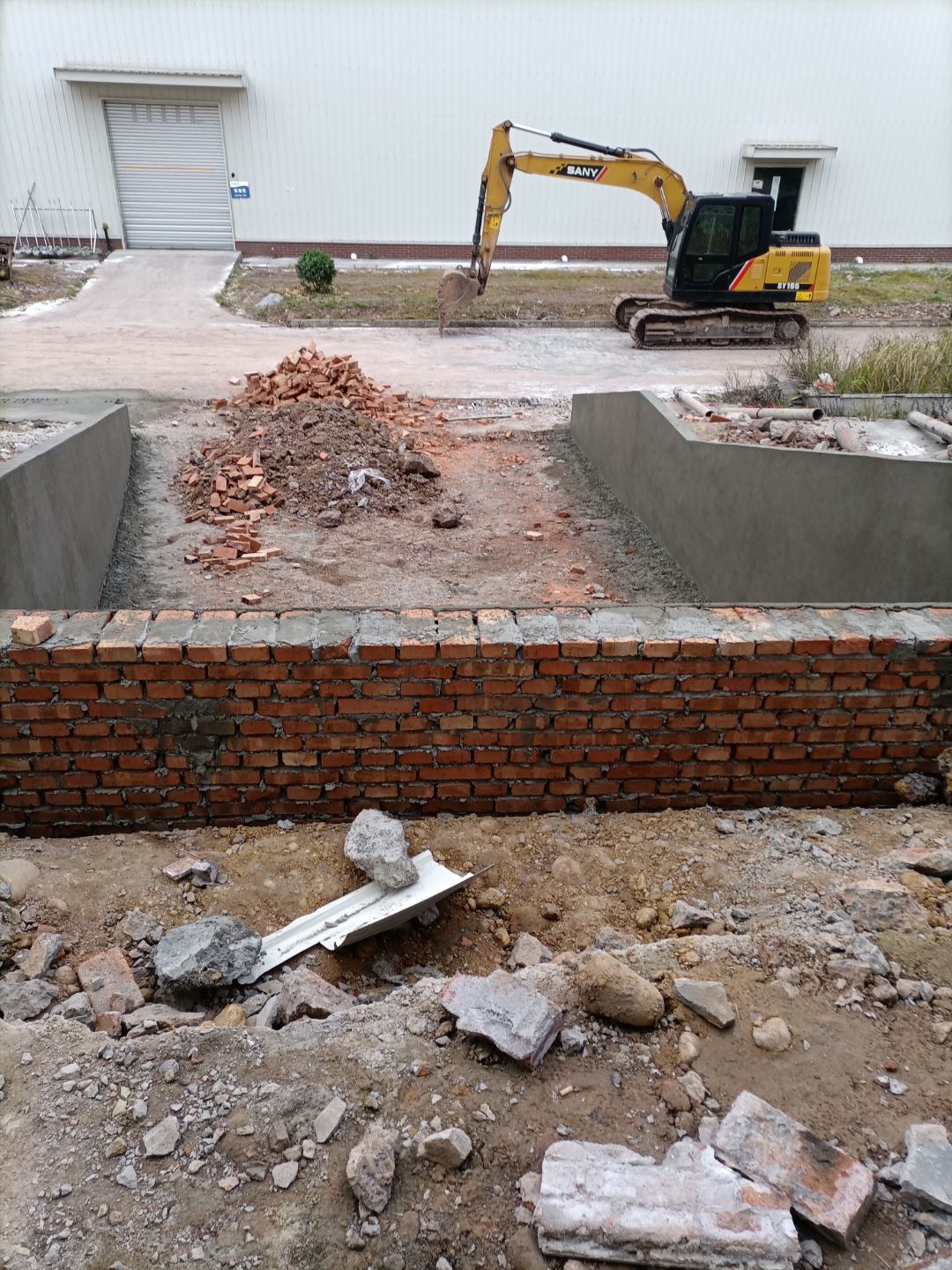 1:增項車流卸貨通道、入沉淀池排水管破除完成100% ;2:排水溝砌磚完成100%、貼磚完成40%; 3:彩鋼板到場。