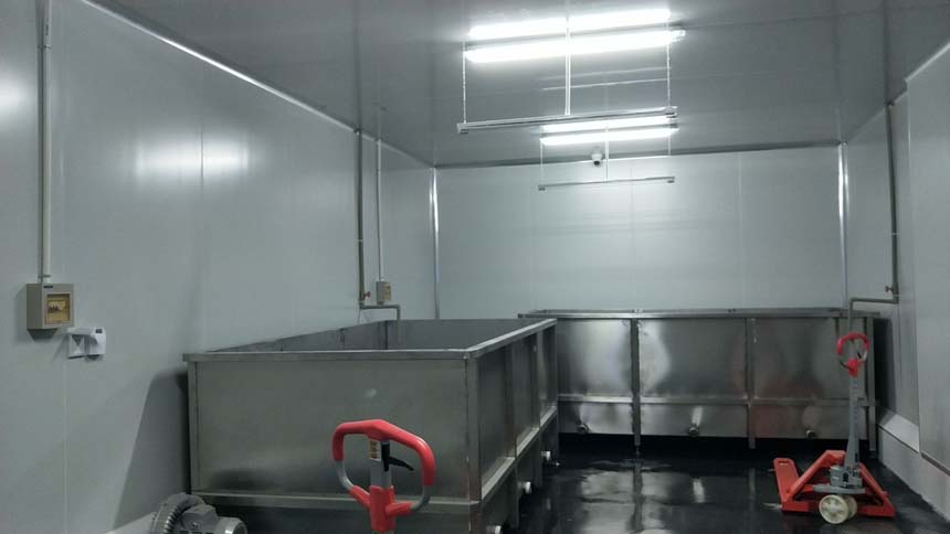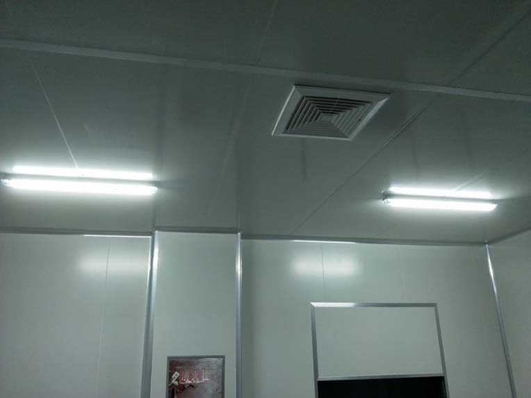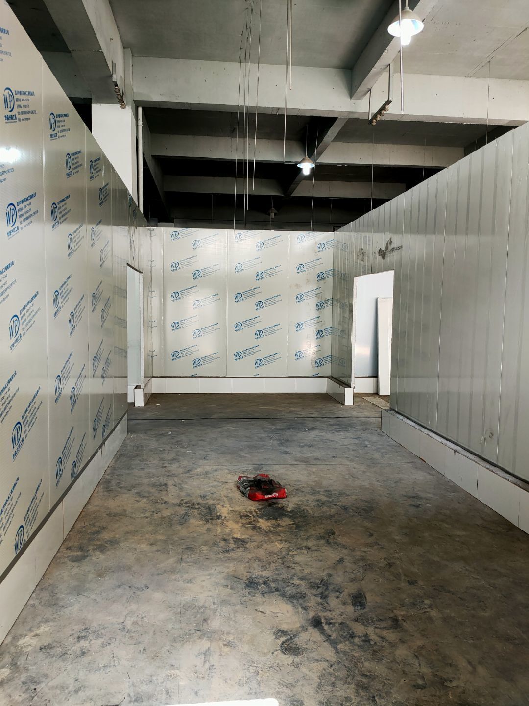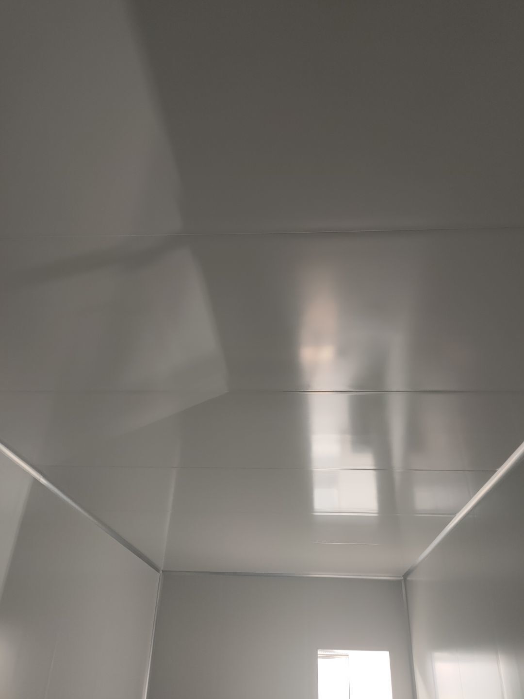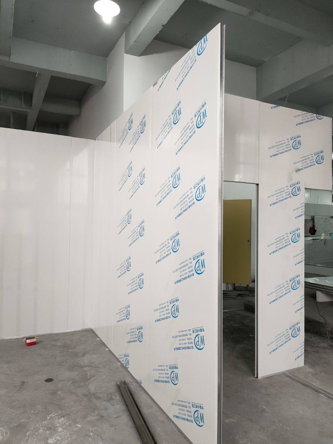 1、彩鋼主體完成100%; 2、圓弧門窗密封工程等完成100%; 3、水電完成45%; 4、三防板吊頂完成100%; 5、新增10公分玻鎂巖棉板完成100%; 6、動力電材料到場; 7、現場衛生打掃