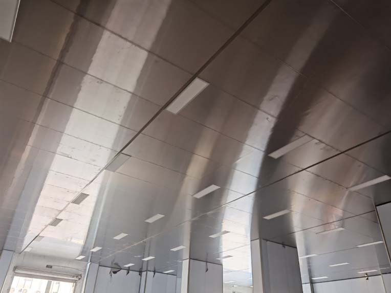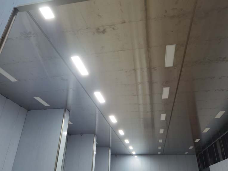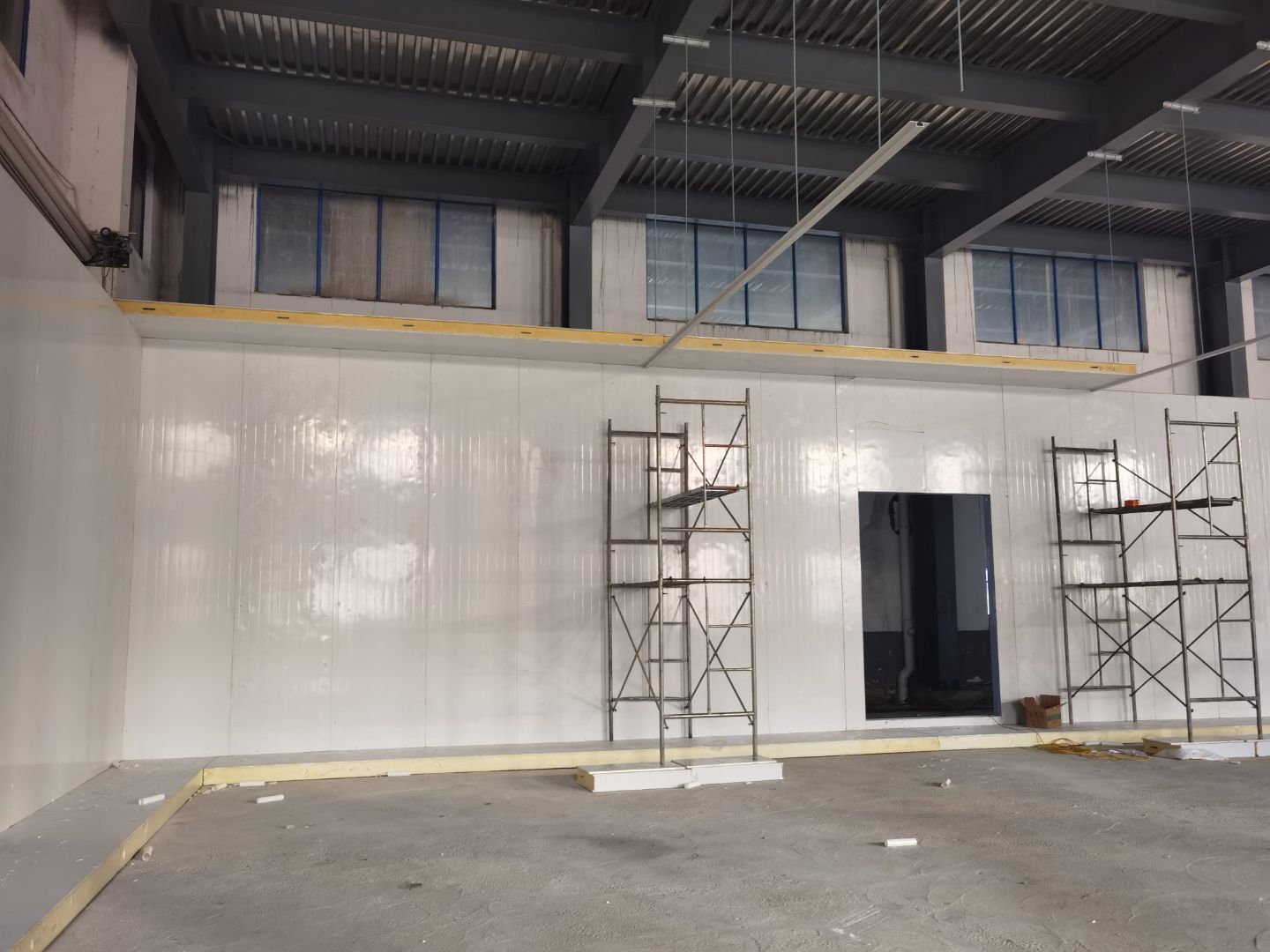今日施工內容 1,彩板拍圓弧 打膠 2, 二層鋁扣板安裝 3,二層風管軟接 4,一層地坪施工 5,凍庫冷媒管安裝 6,二層墻板安裝 7,一層消防煙感安裝 8,蒸汽管道施工 9,門體安裝 今日材料進場 彩板 消防主水管 工藝設備
