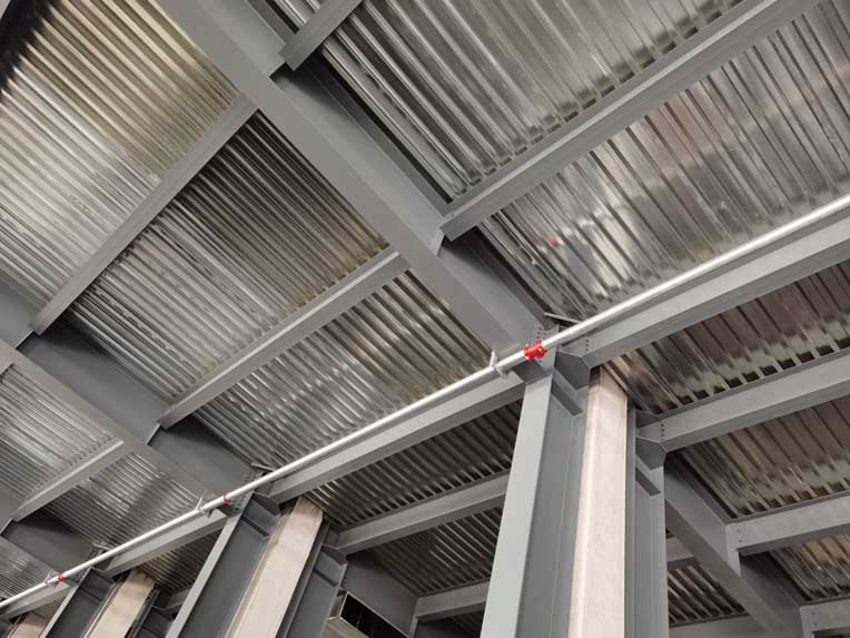 今日施工內容: 1,彩板頂板安裝 掛T鋁 2,室外門衛安抹灰 3,二樓動力電橋架支架開始施工 4,室外消防水箱安裝 5,土建擋水墻斜抹灰 修補 6,二樓消防噴淋施工 7,室外外墻噴真石漆