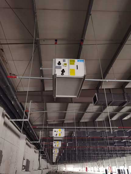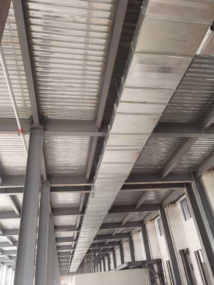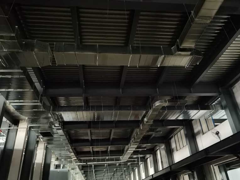 1,一樓地槽 彩板 吊筋安裝 2,一樓鋼構頂刷漆 3,一層鋼構平臺施工 4,西邊室外雨水管安裝 5,一樓凍庫門體安裝 6,一樓空調風管吊裝 7,二樓空調柜機吊裝 8,電梯施工