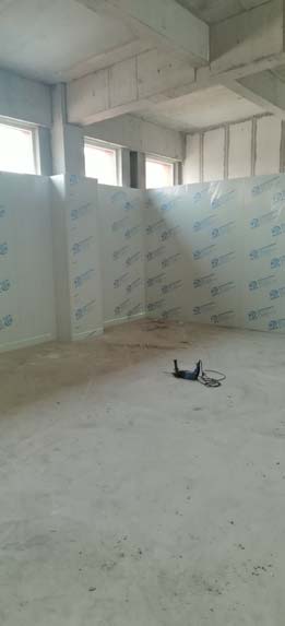 ①彩鋼墻板立板完成60% ②衛生間土建施工完成100% ③ 凍庫制作安裝完成80% ④ 衛生間鋁扣板吊頂已完成100
