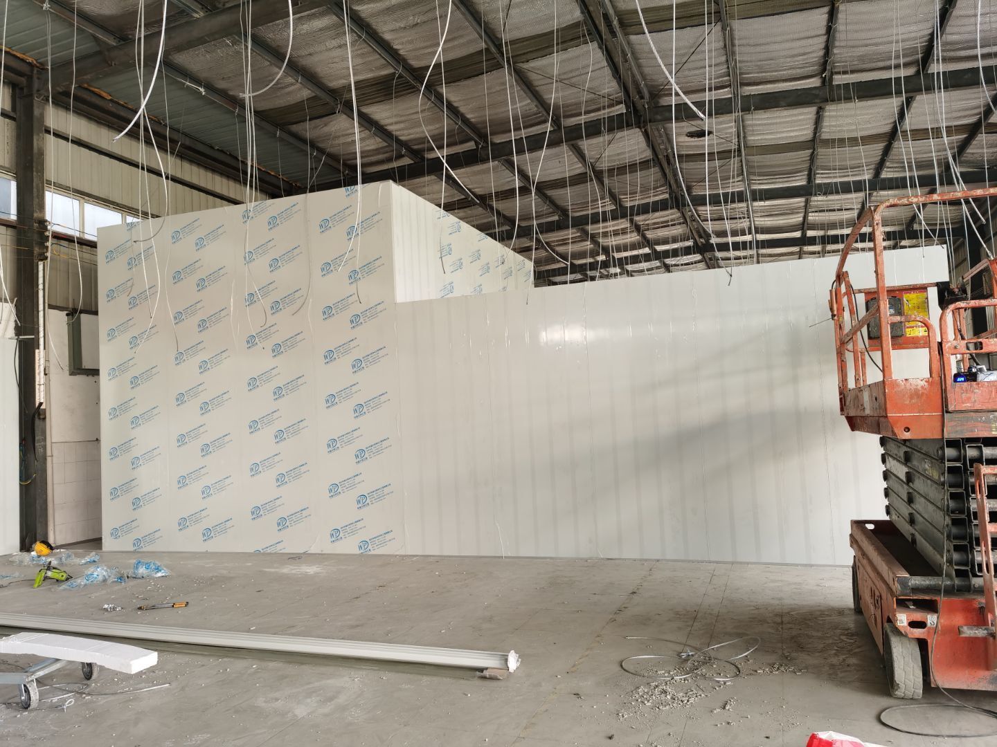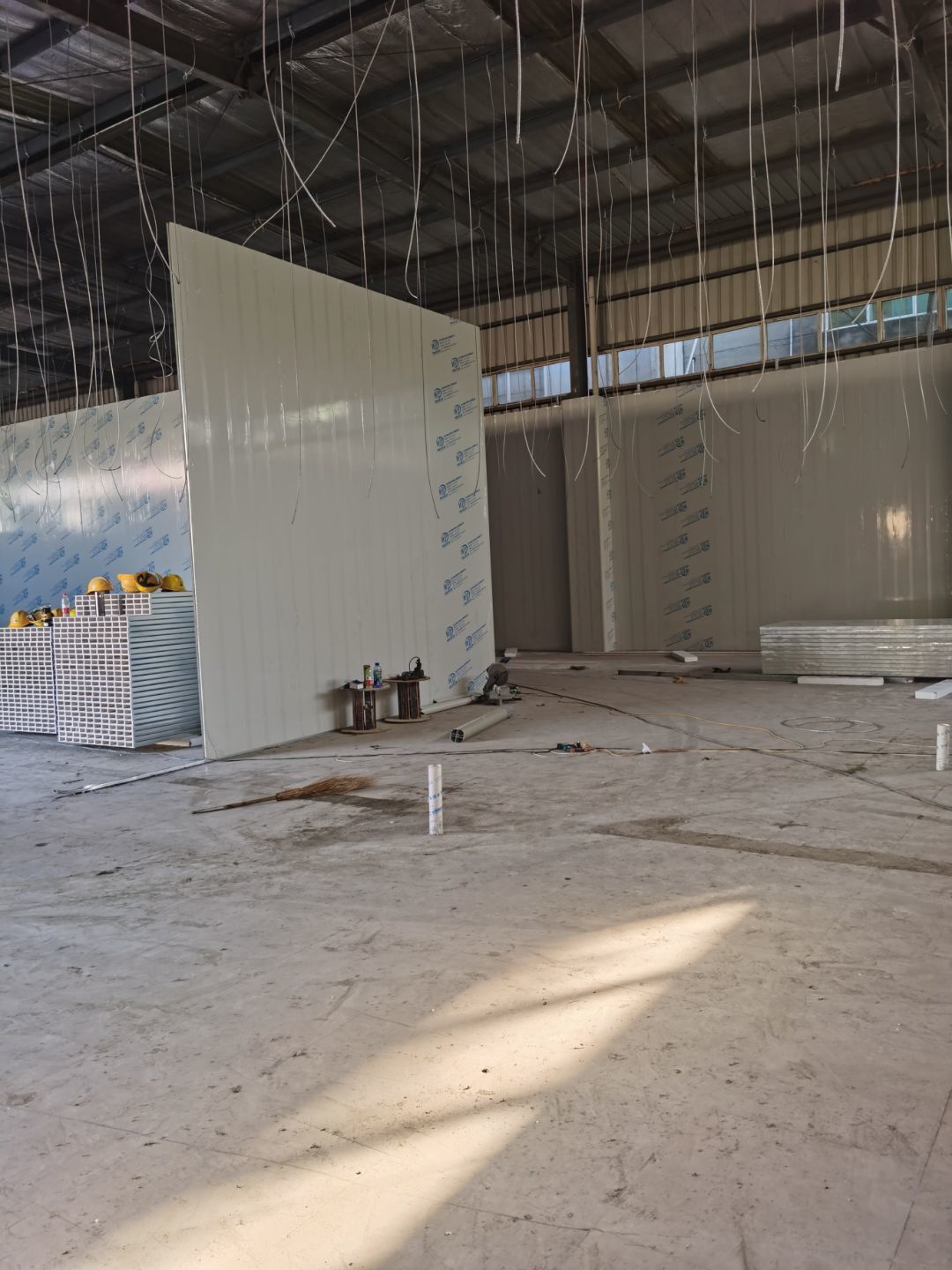 1、排水溝及凍庫切割完成100% 2、 破碎完成100% 3、 吊頂鋼繩下料完成100% 4、 排水溝接管完成100% 5. 排水溝回填并發水完成100% 6. 彩鋼墻板完成20% 7. 土建活完成30% 8, C型鋼加固完成20%