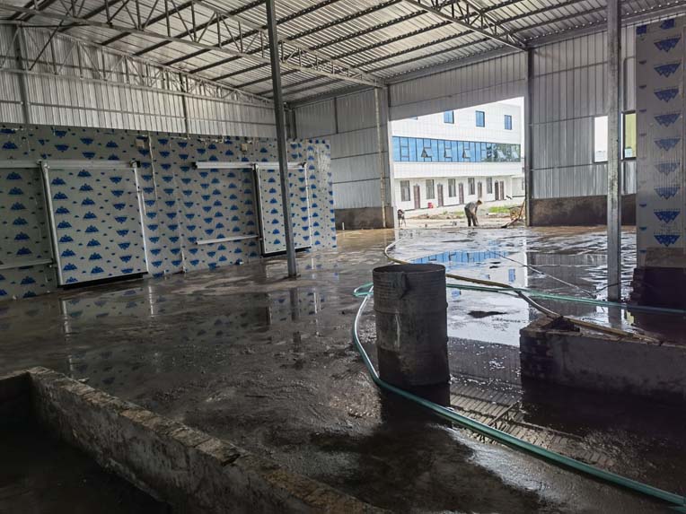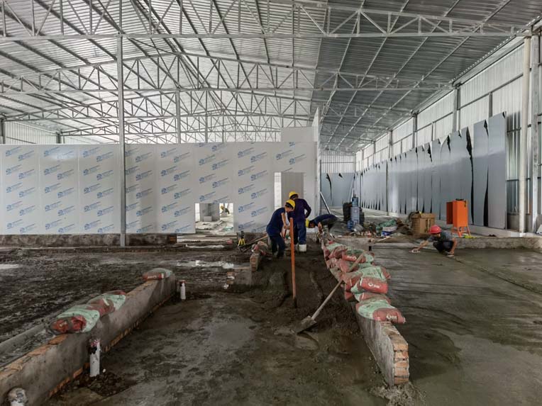 1.浸泡間與煮制間彩鋼墻板安裝完成百分之八十。 2.混凝土澆筑準備工作完成。