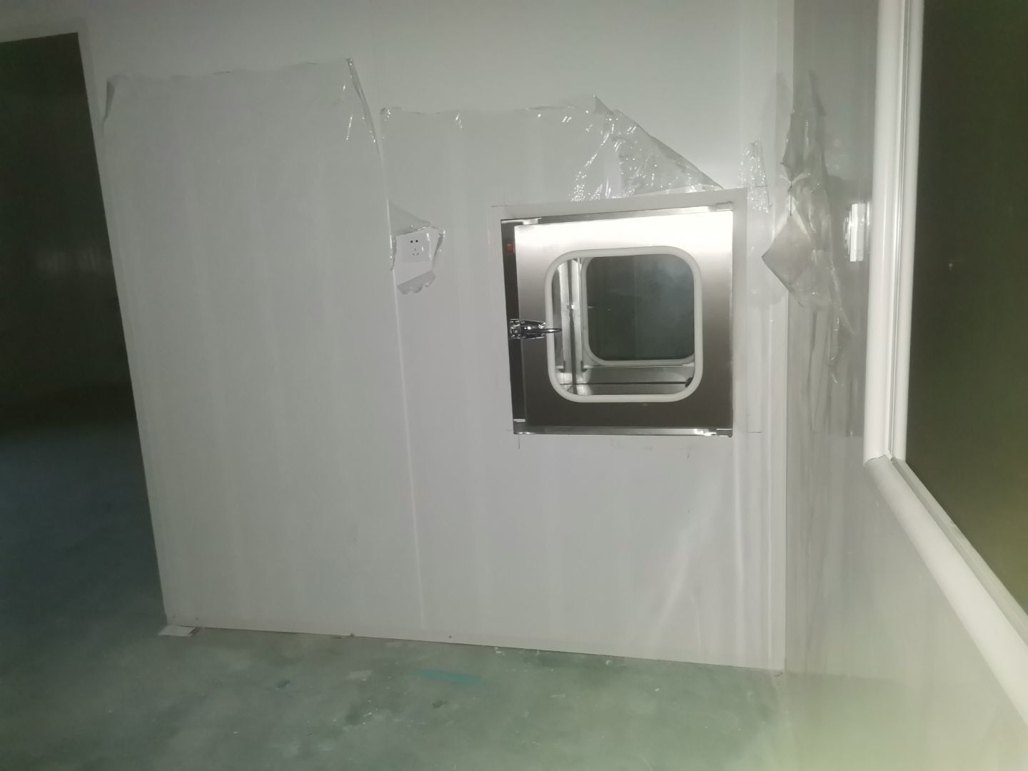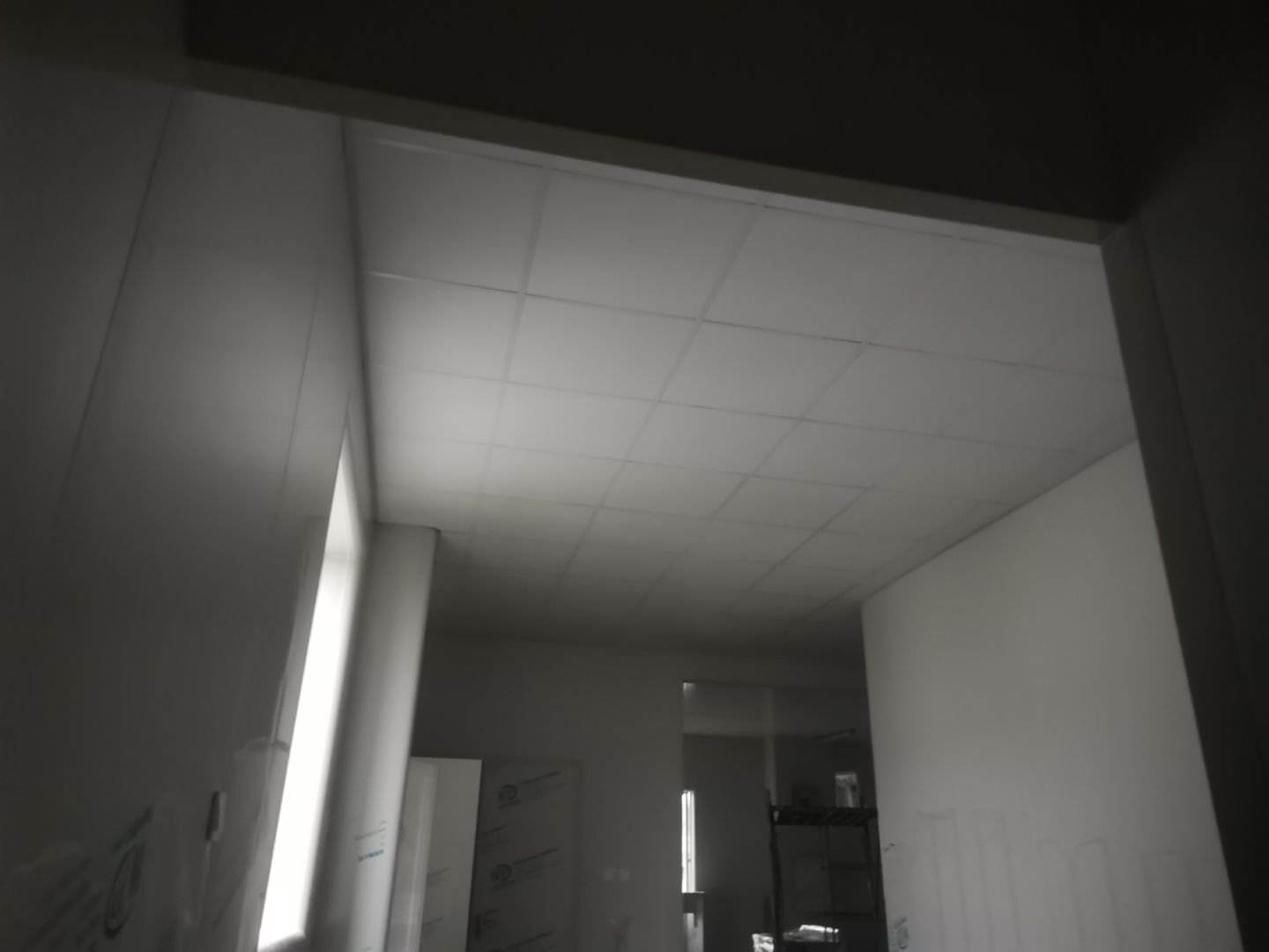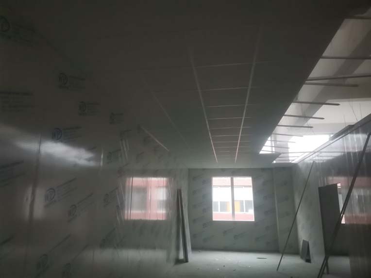 1.頂板安裝完成100%; 2.三防板吊頂完成100%; 3.水電安裝完成90%,燈具安裝完成95%; 4.新增動力電完成90%; 5.衛生間隔墻完成100%; 6.腳踏池完成100%; 7.風淋室制作完成90%; 8.地坪膩子層完成80%; 9.場地清理。
