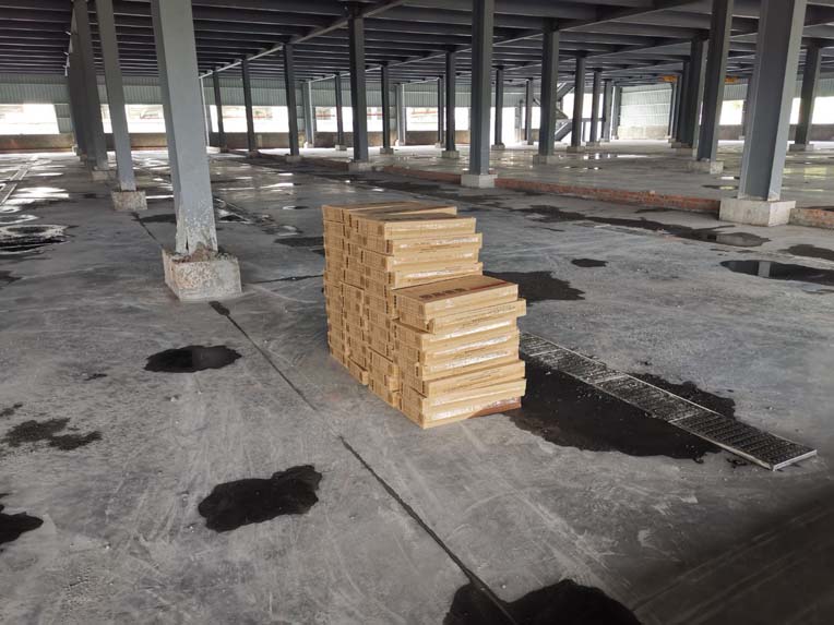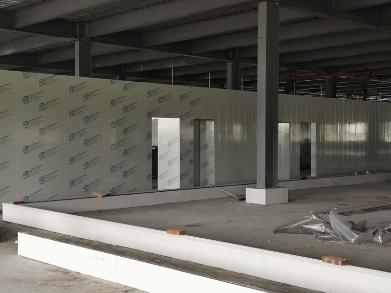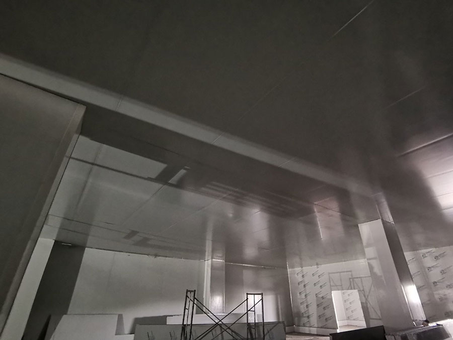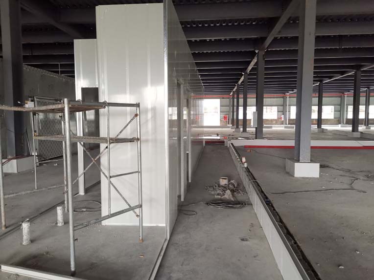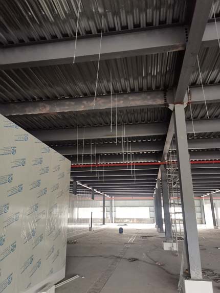 1、材料三防板到貨 2、彩鋼工程打膠安裝圓弧完成總體50% 3、LED平板燈安裝完成總體70%