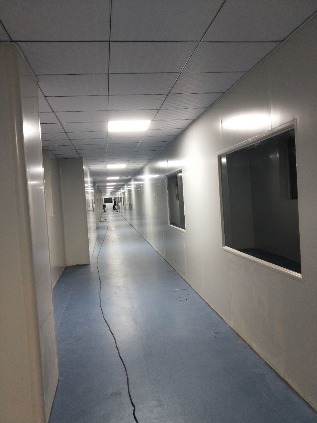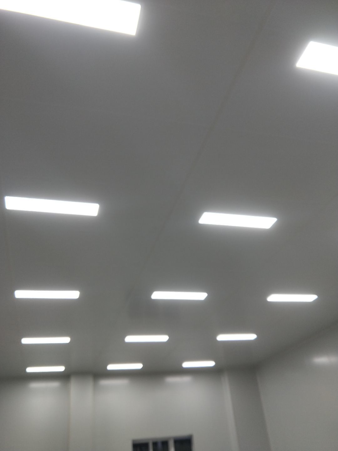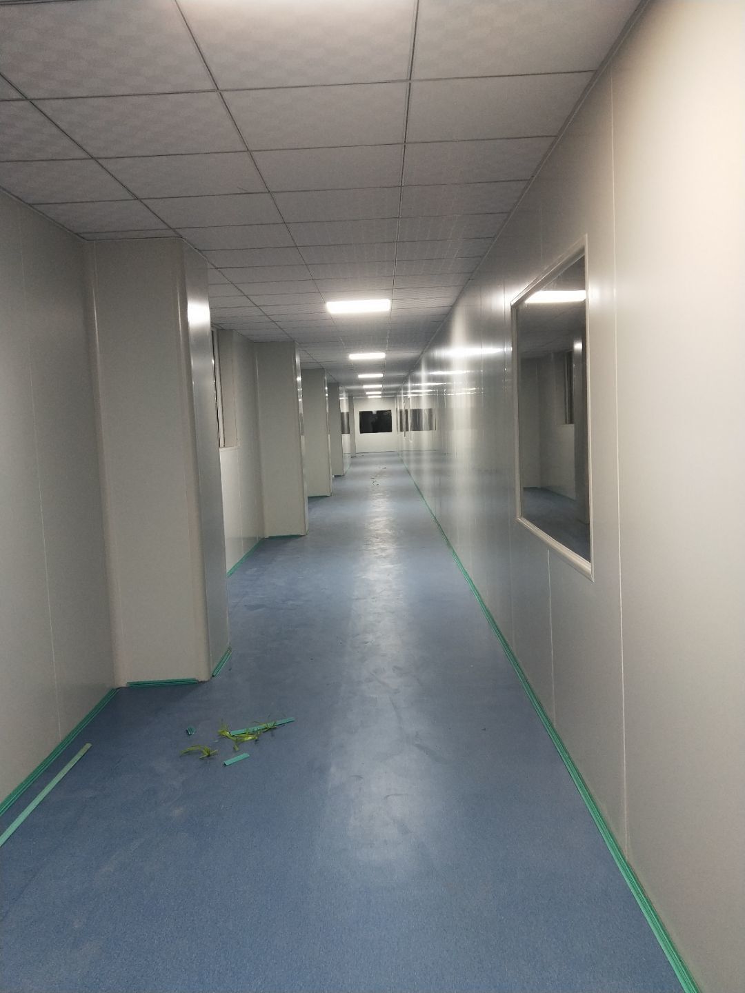 1:彩鋼墻板完成100% 2:彩鋼頂板完成100% 3:撕膜打膠完成98% 4:自制門窗完成95% 5:水電完成100% 6:圓弧完成97% 7:金剛砂完成100% 8:三防板吊頂完成100% 9:地面固化完成100% 10:動力電完成100% 11:空調安裝完成100% 12:聚氨酯地面完成100% 13:理化室新增墻板和吊頂完成100% 14:PVC地坪完成100%