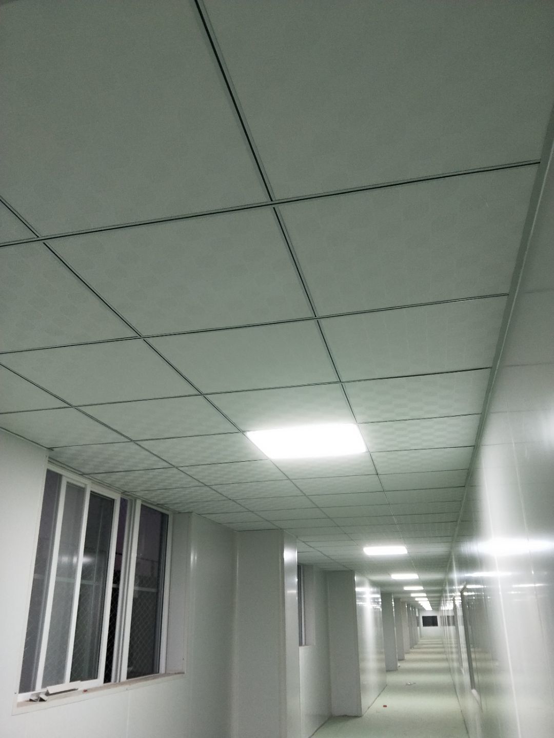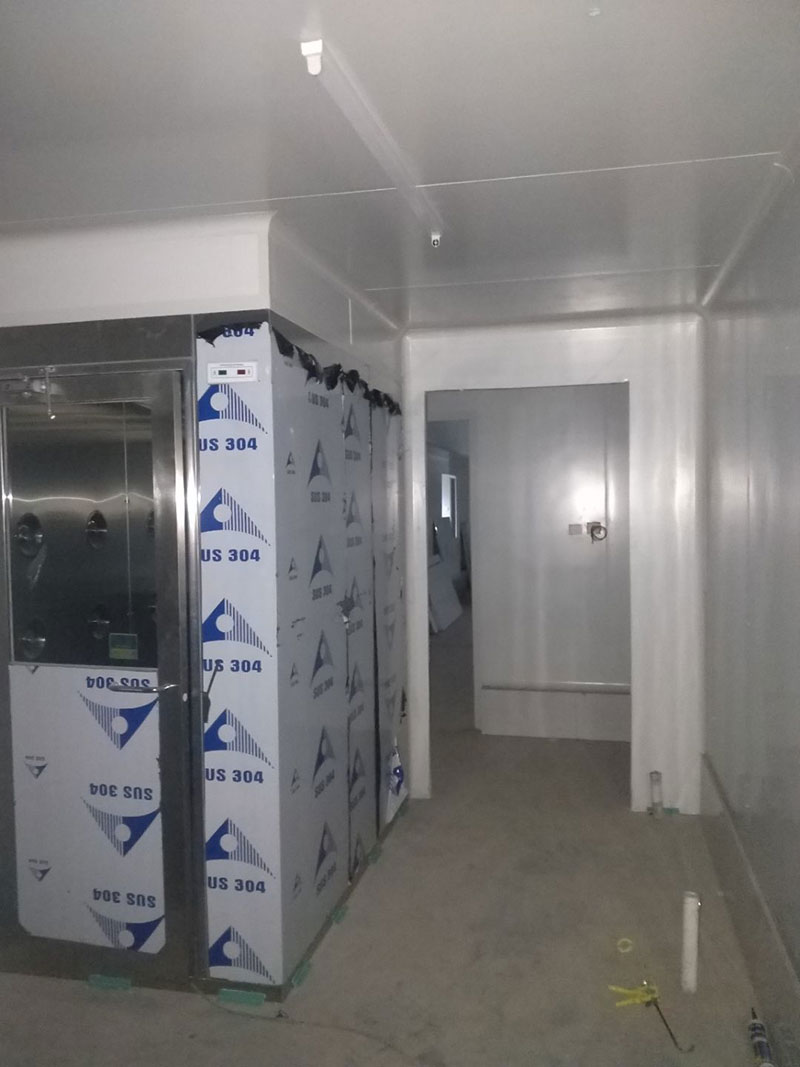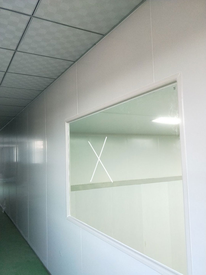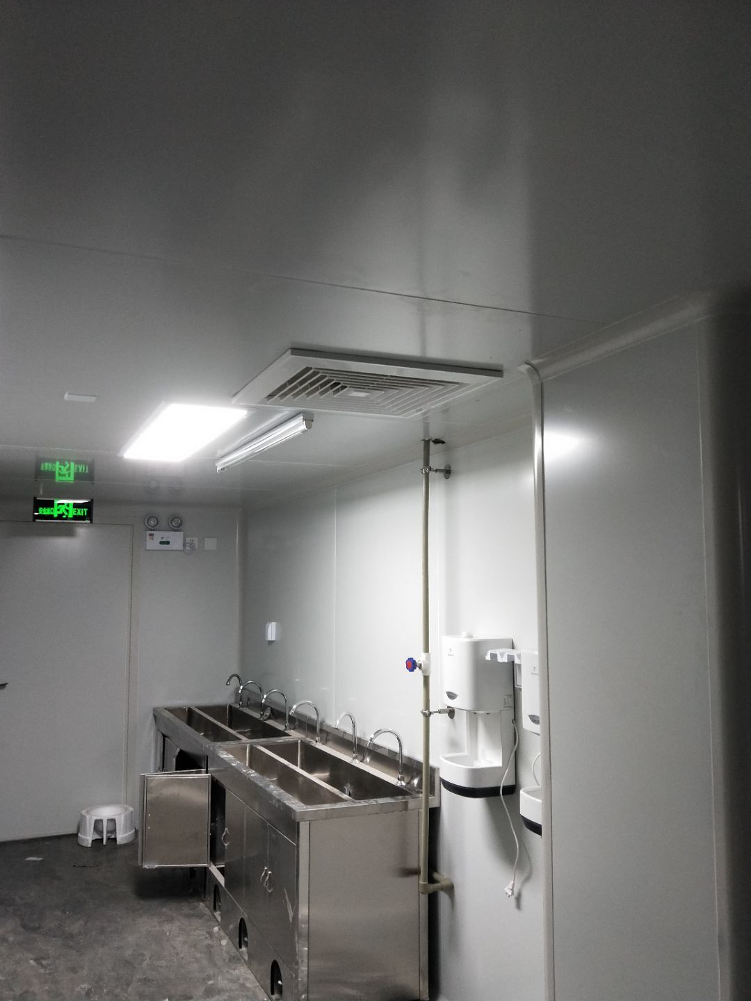 1:彩鋼墻板完成100% 2:彩鋼頂板完成100% 3:撕膜打膠完成98% 4:自制門窗完成95% 5:水電完成100% 6:圓弧完成97% 7:金剛砂完成100% 8:三防板吊頂完成100% 9:地面固化完成100% 10:動力電完成100% 11:空調安裝完成100% 12:聚氨酯地面完成100% 13:理化室新增墻板和吊頂完成100% 14:PVC地坪完成100%
