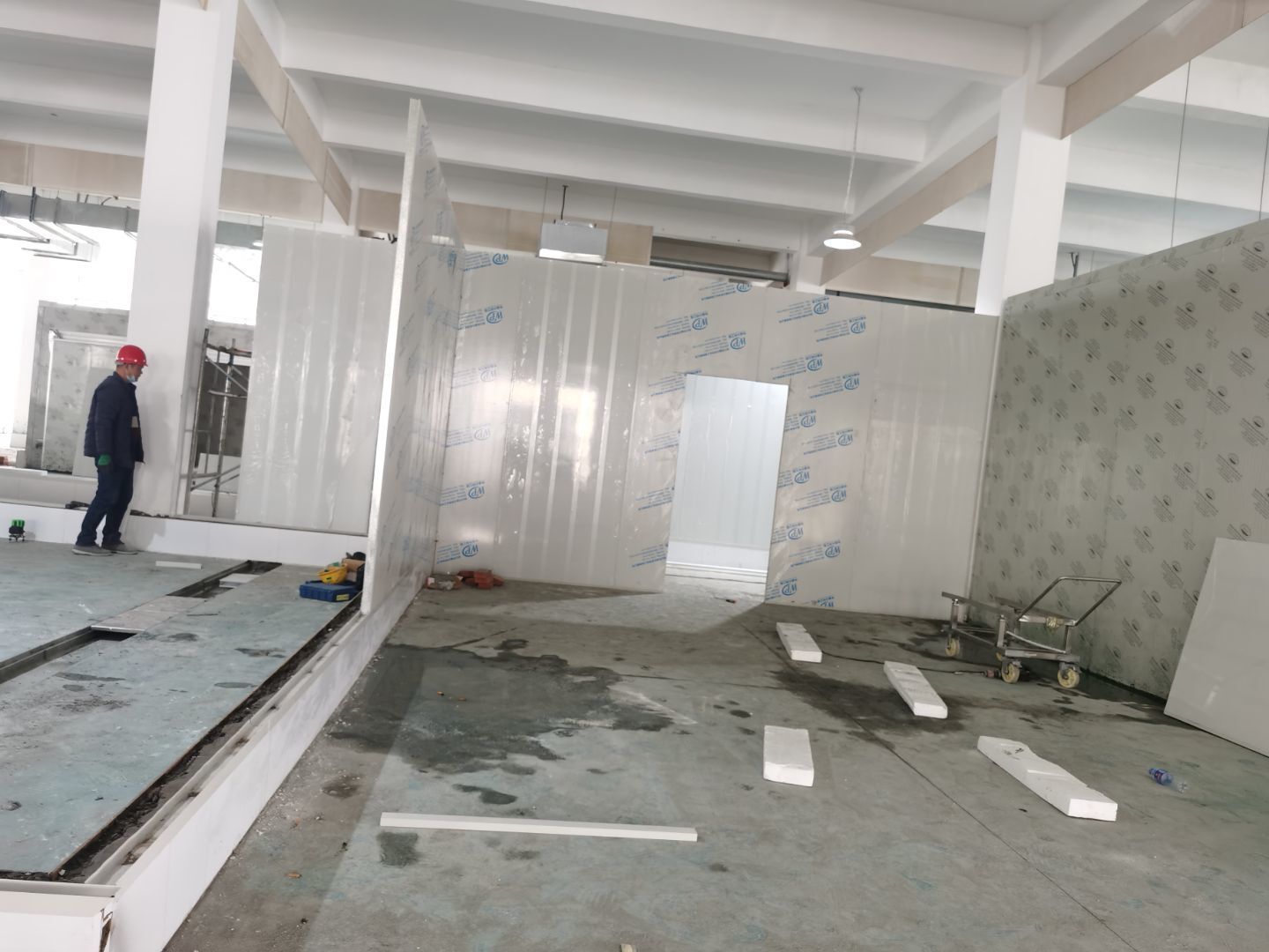 今日施工內容。 ①擋水墻貼瓷磚完成 進度100% ②彩鋼墻板施工第12天,完成進度100% ③彩鋼板頂板完成進度100% ④彩鋼板收尾工作完成進度95% ⑤彩鋼板門,窗,制作及安裝完成80% ⑥固化地面施工第7天,完成進度95% ⑦,水電進場施工第5天,完成進度75%