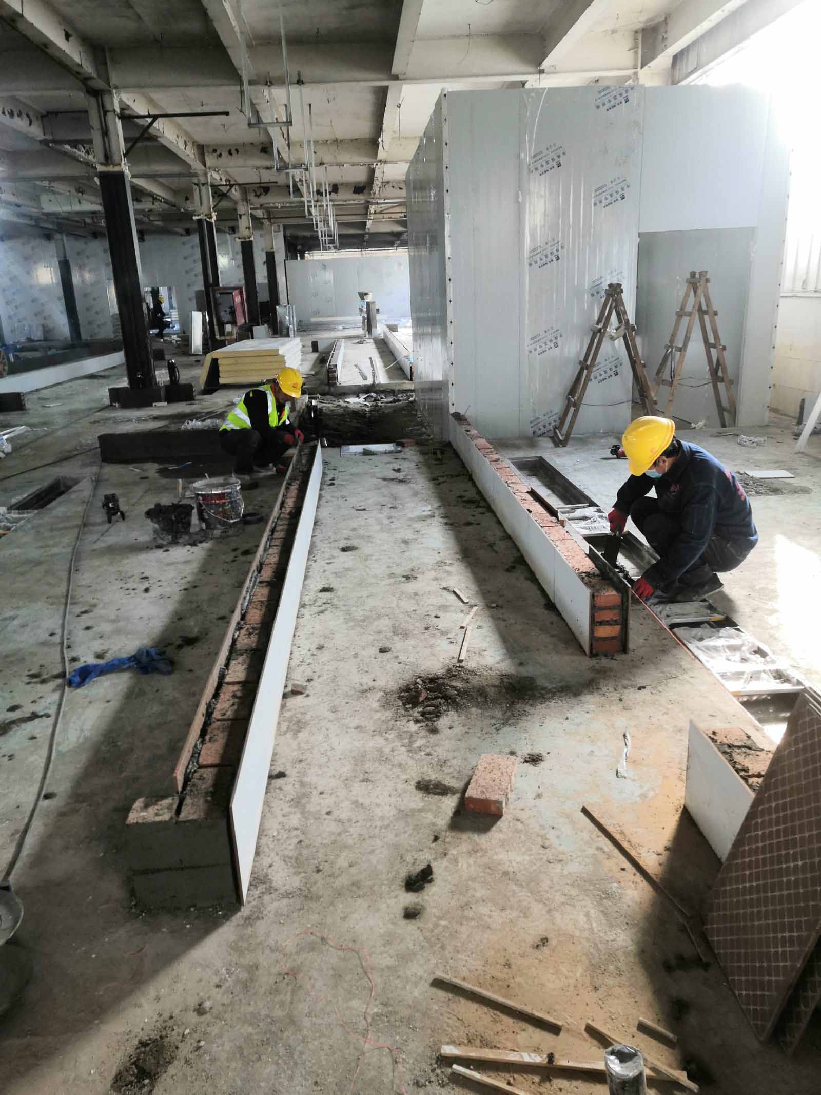 1、擋水墻貼磚和抹面,空調水管焊接架子及主管道安裝,風機盤管吊裝,凍庫板安裝,風管安裝,彩鋼板頂板制作吊筋。